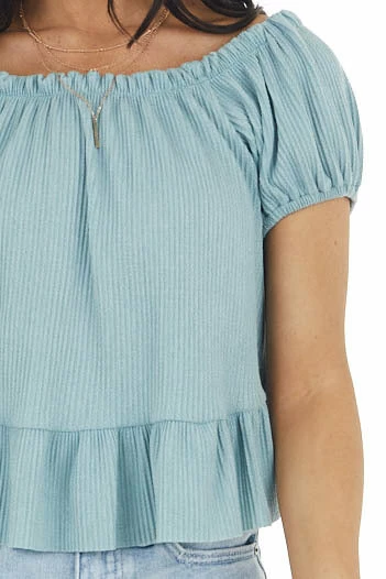 - Sage Boat Neckline Ribbed Knit Crop Top with Ruffles