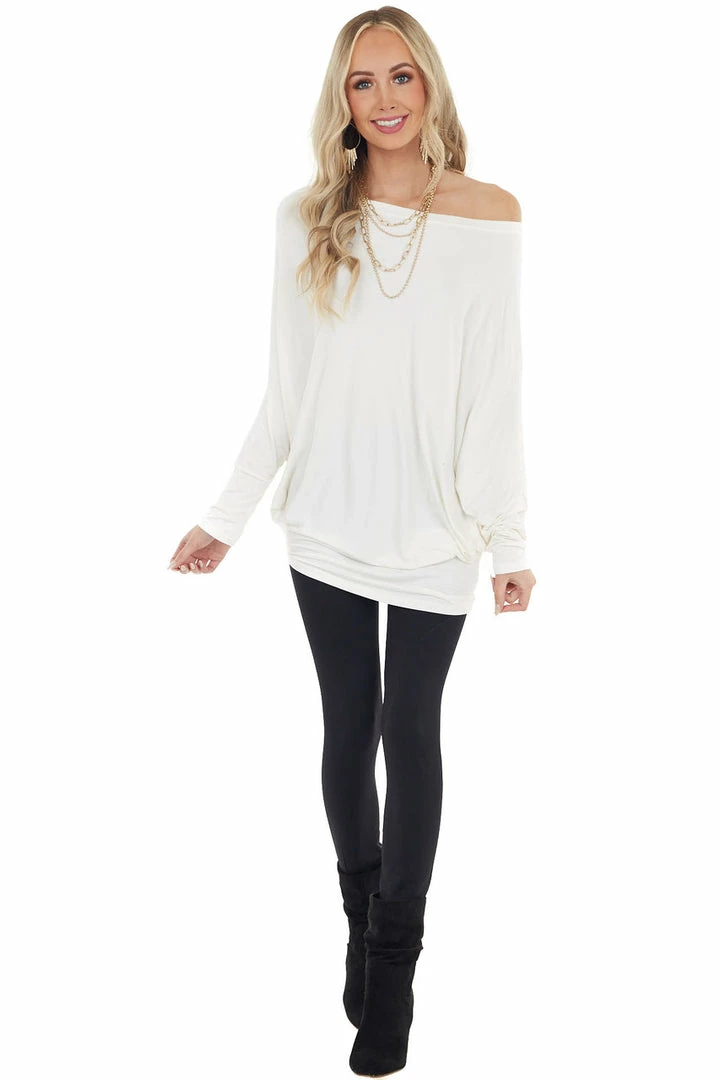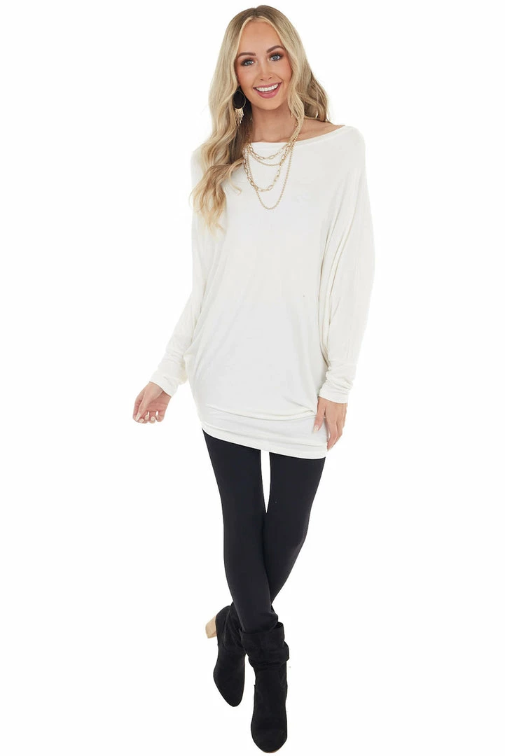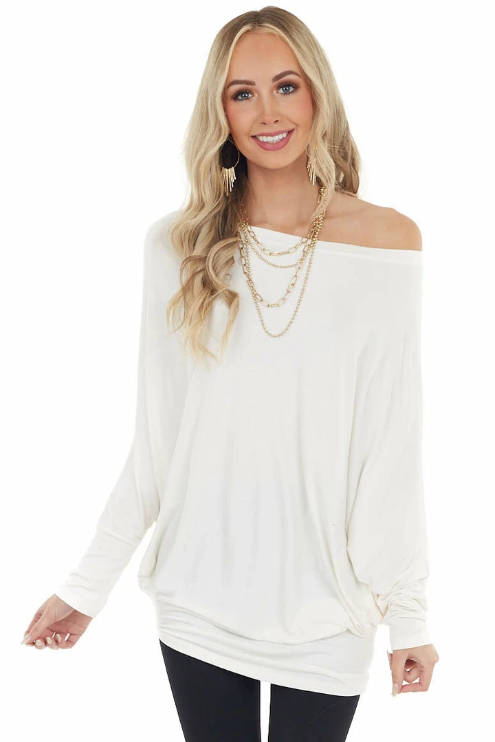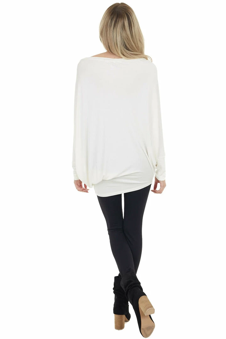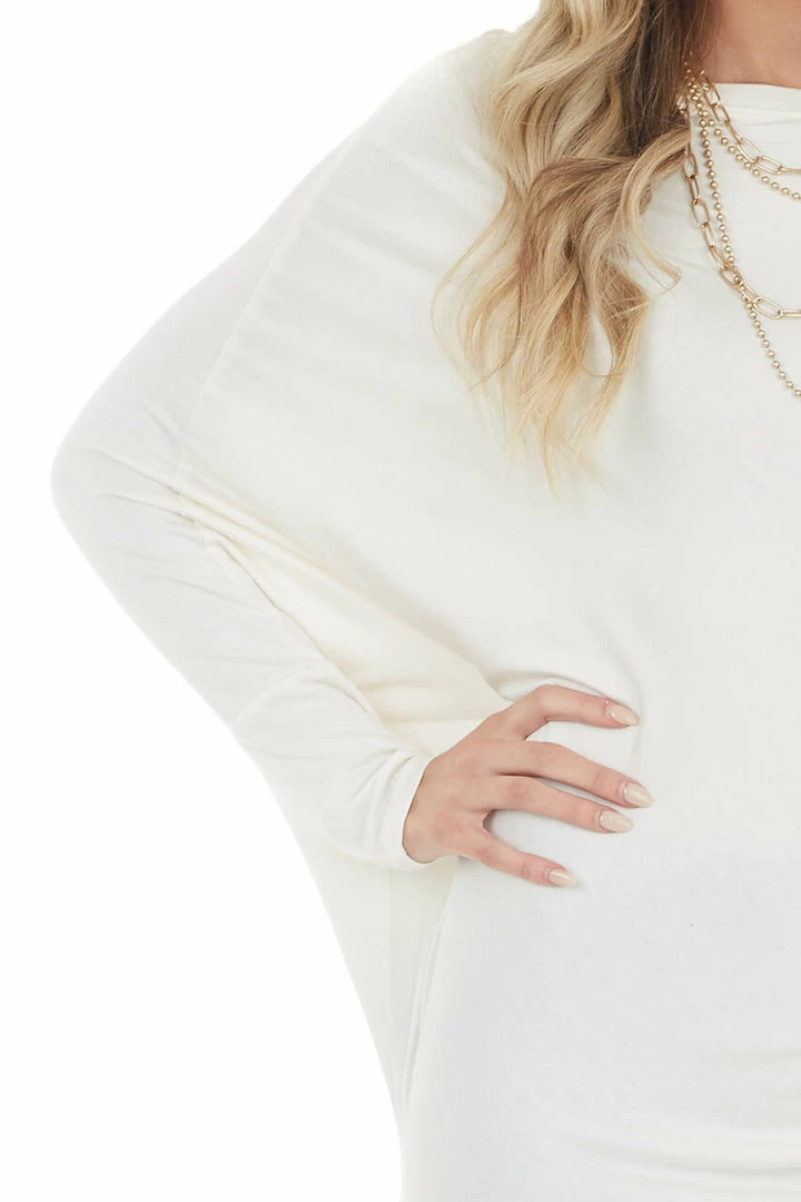- Cream Long Dolman Sleeve Knit Top with Asymmetrical Hemline