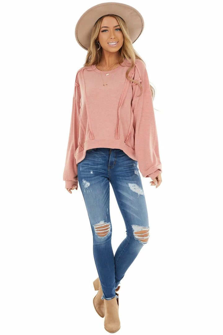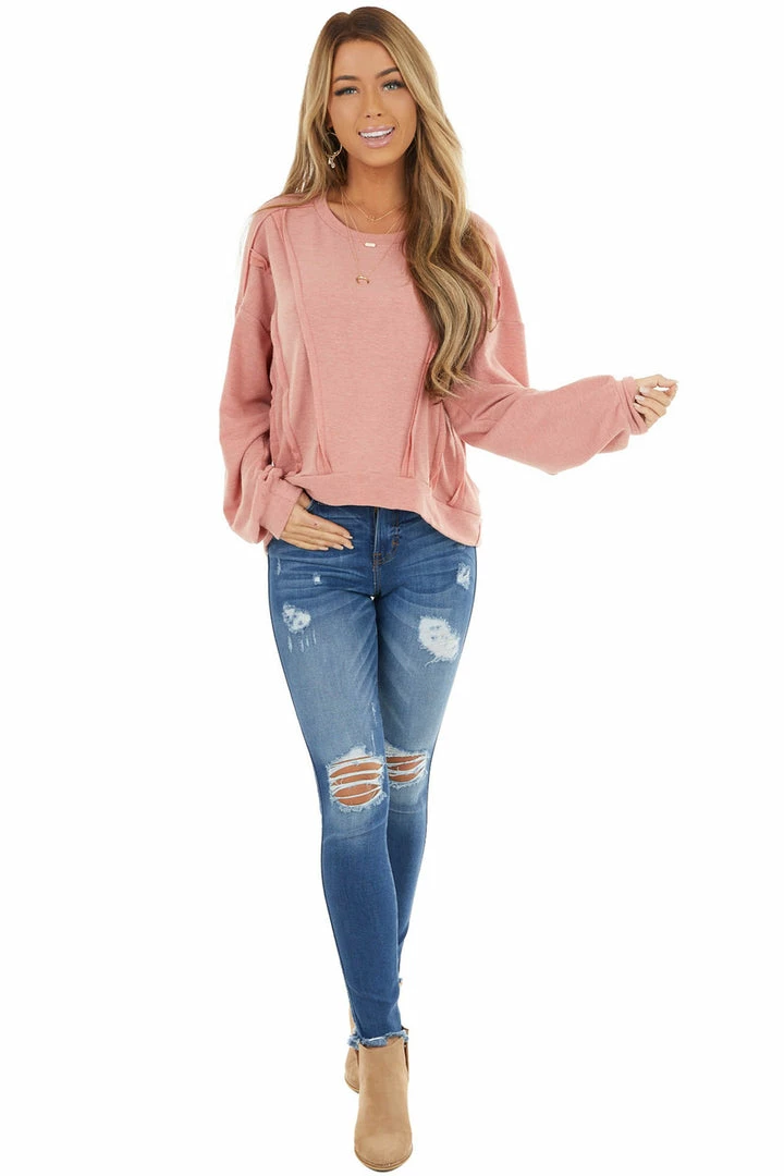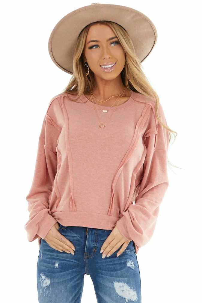- Dusty Coral Stretchy Long Sleeve Top with Raw Edge Details