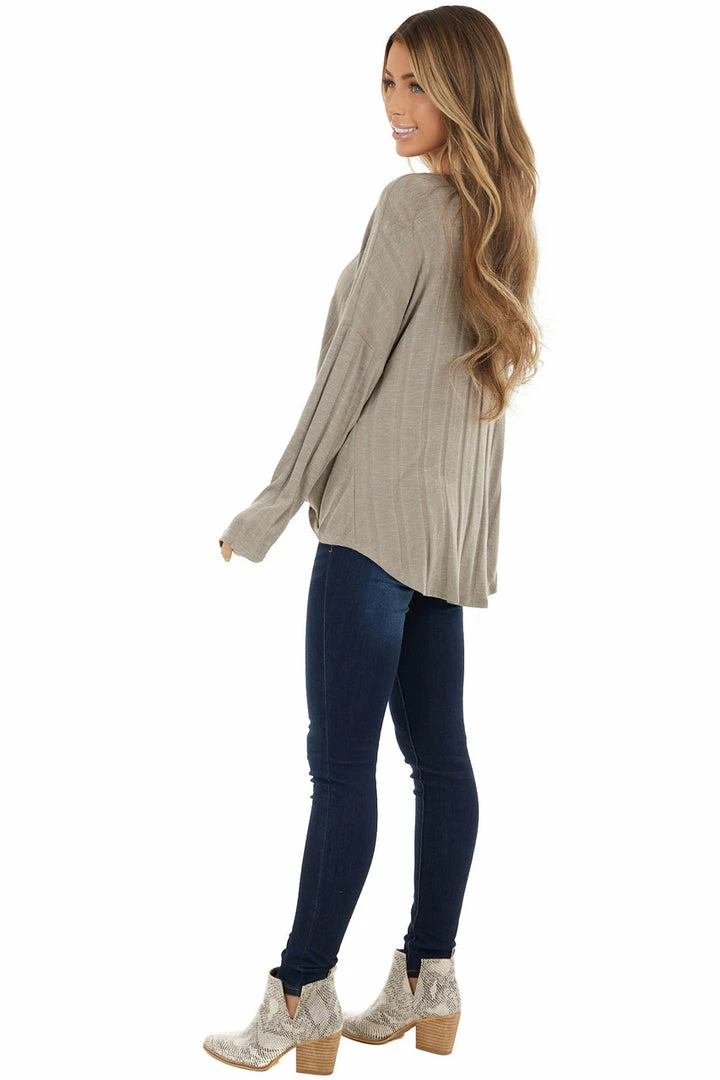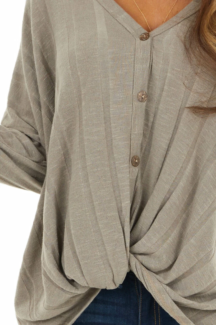- Taupe Button Up Long Sleeve Knit Top with Front Knot Detail