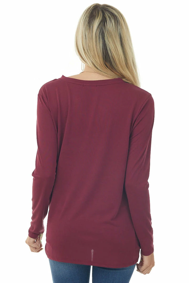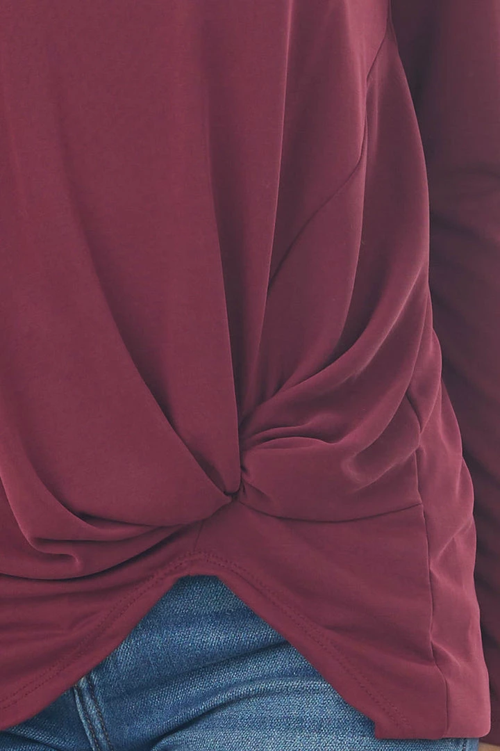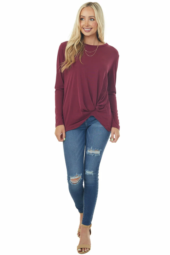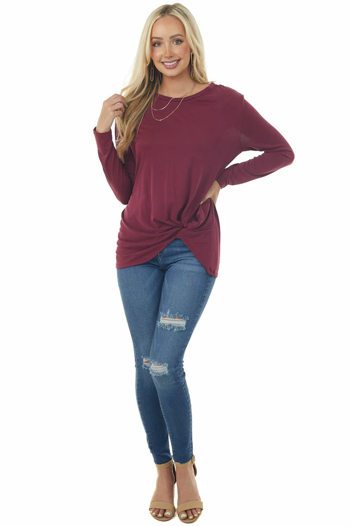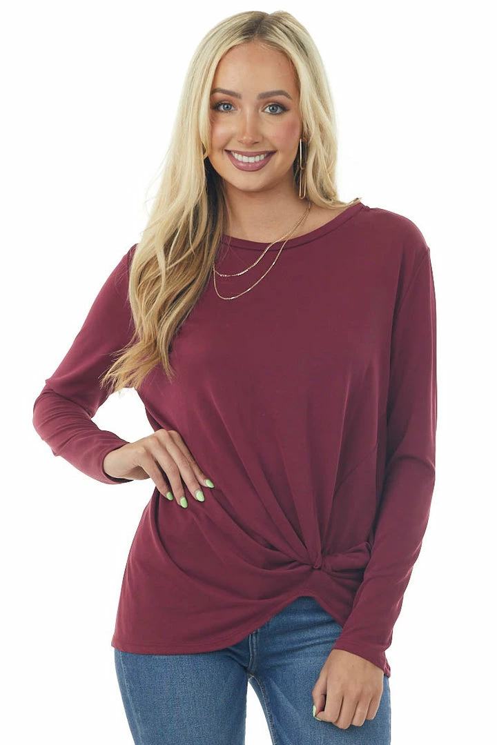 - Wine Long Sleeve Knit Top with Front Twisted Knot Detail
