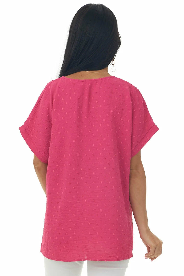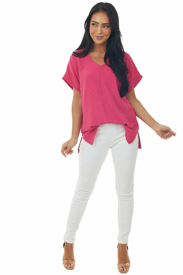 - Fuchsia Swiss Dot Short Sleeve V Neck Top