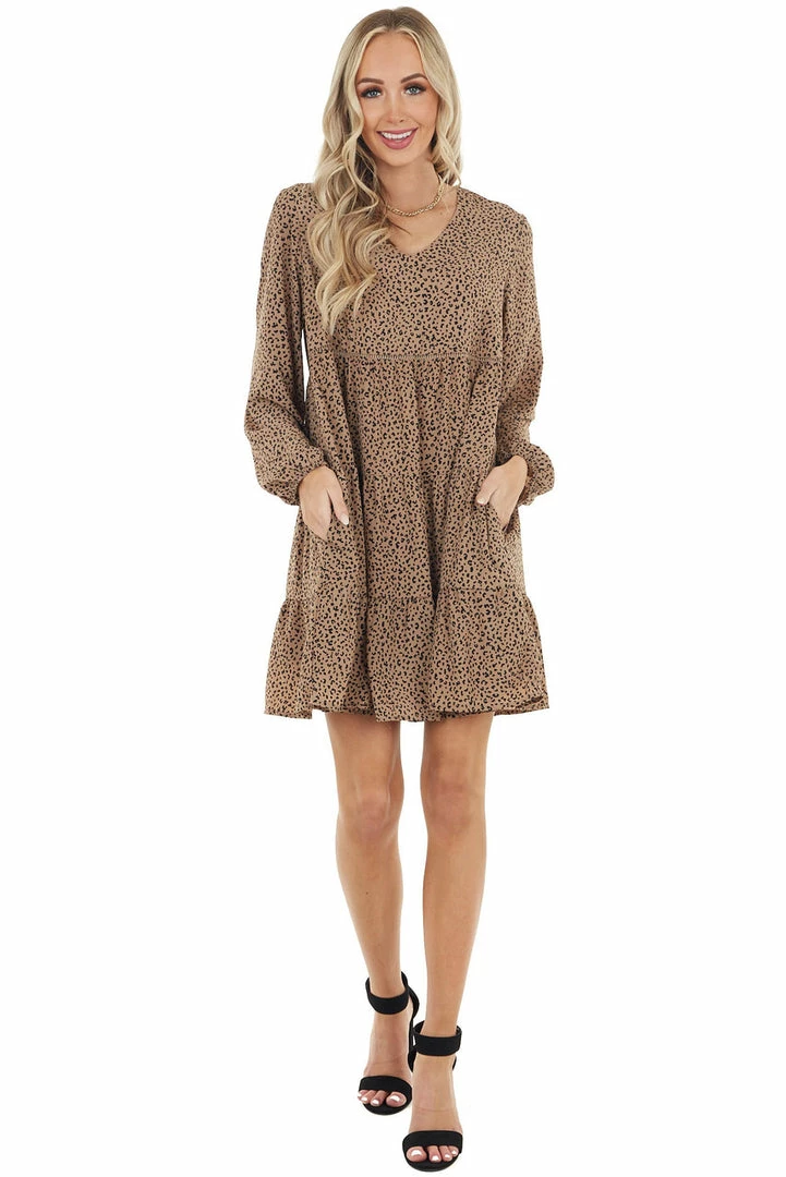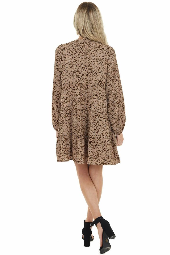 - Latte Leopard Print Tiered Short Dress with Long Sleeves