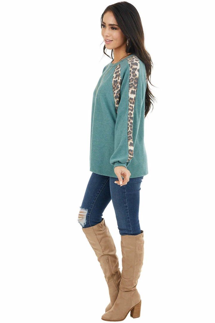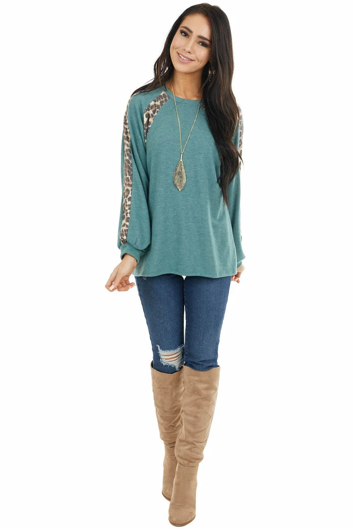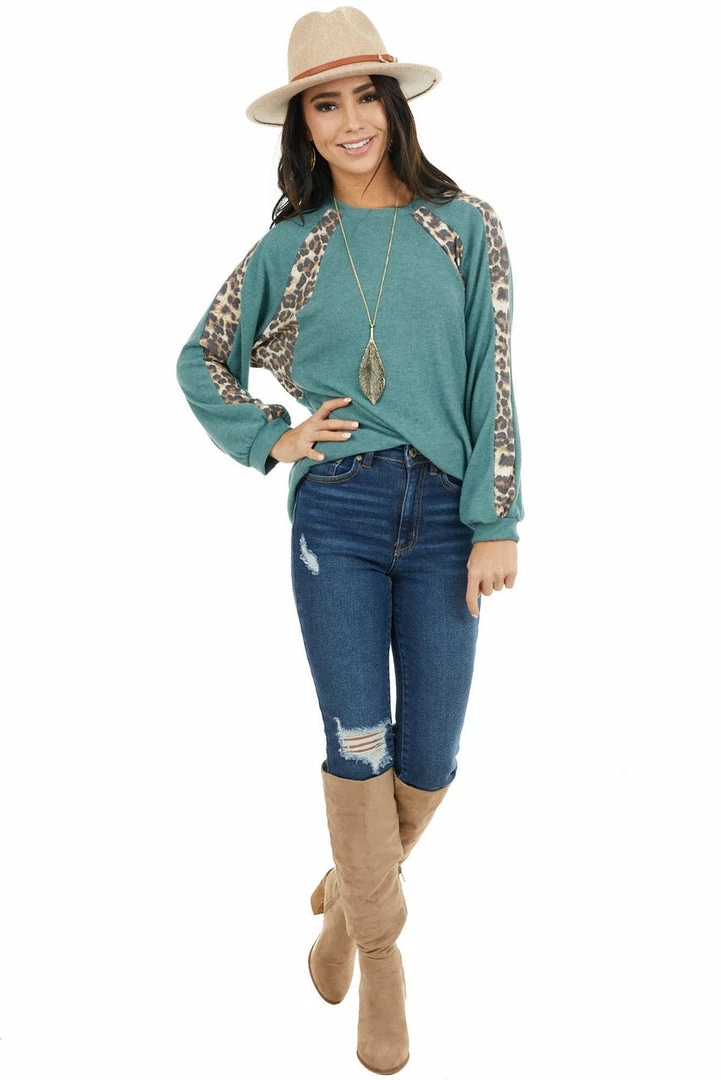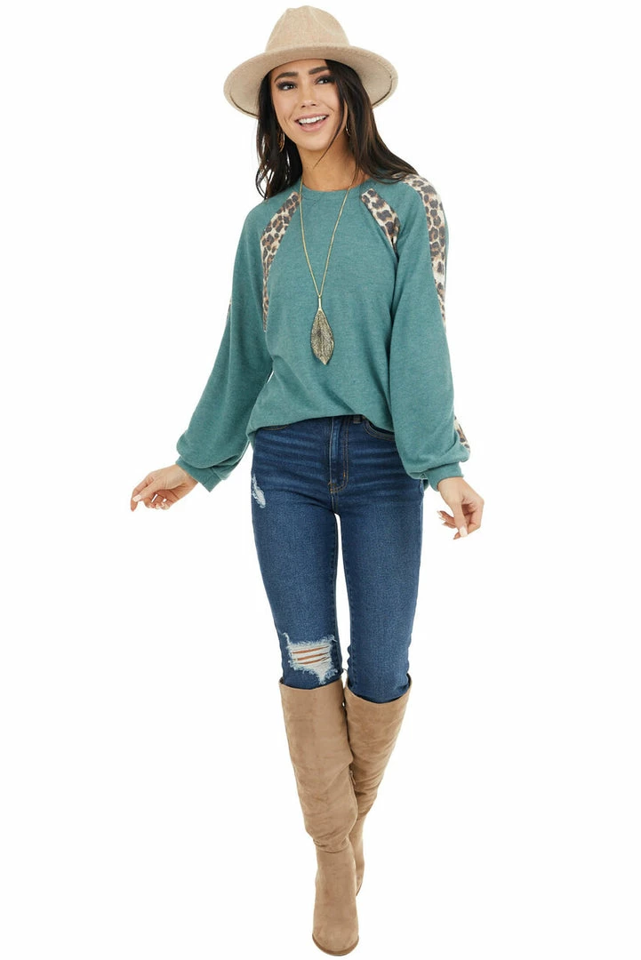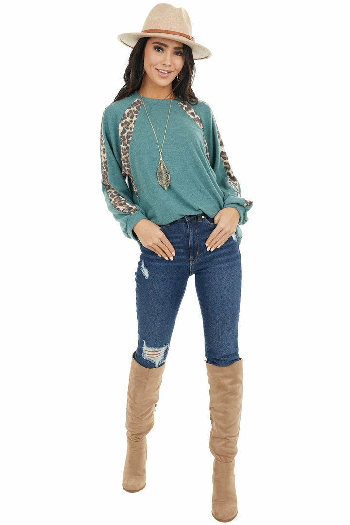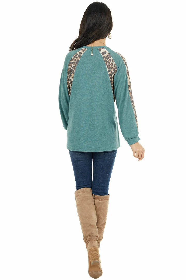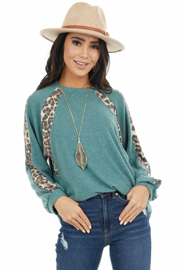 - Pine Green and Leopard Print Colorblock Long Sleeve Top