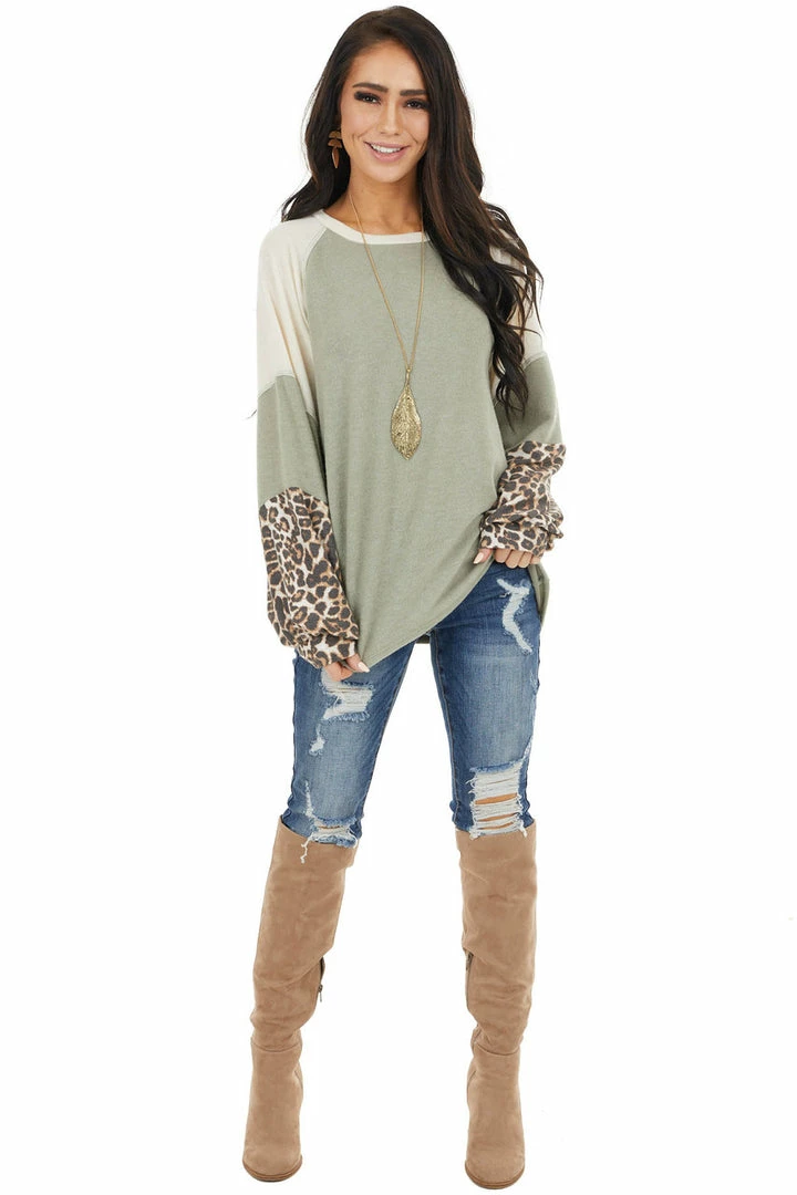 - Sage and Cream Colorblock Top with Leopard Print Details