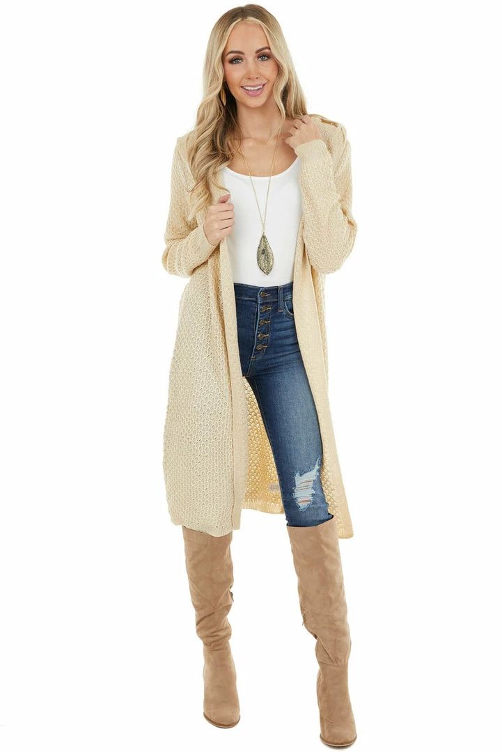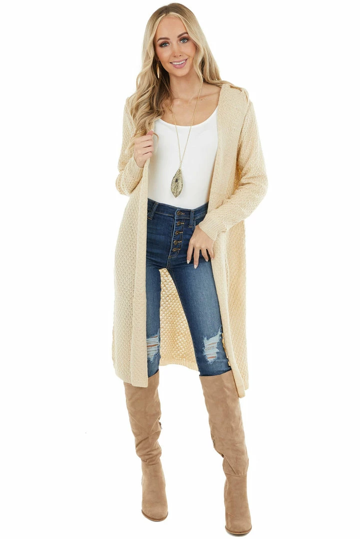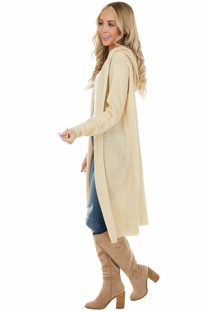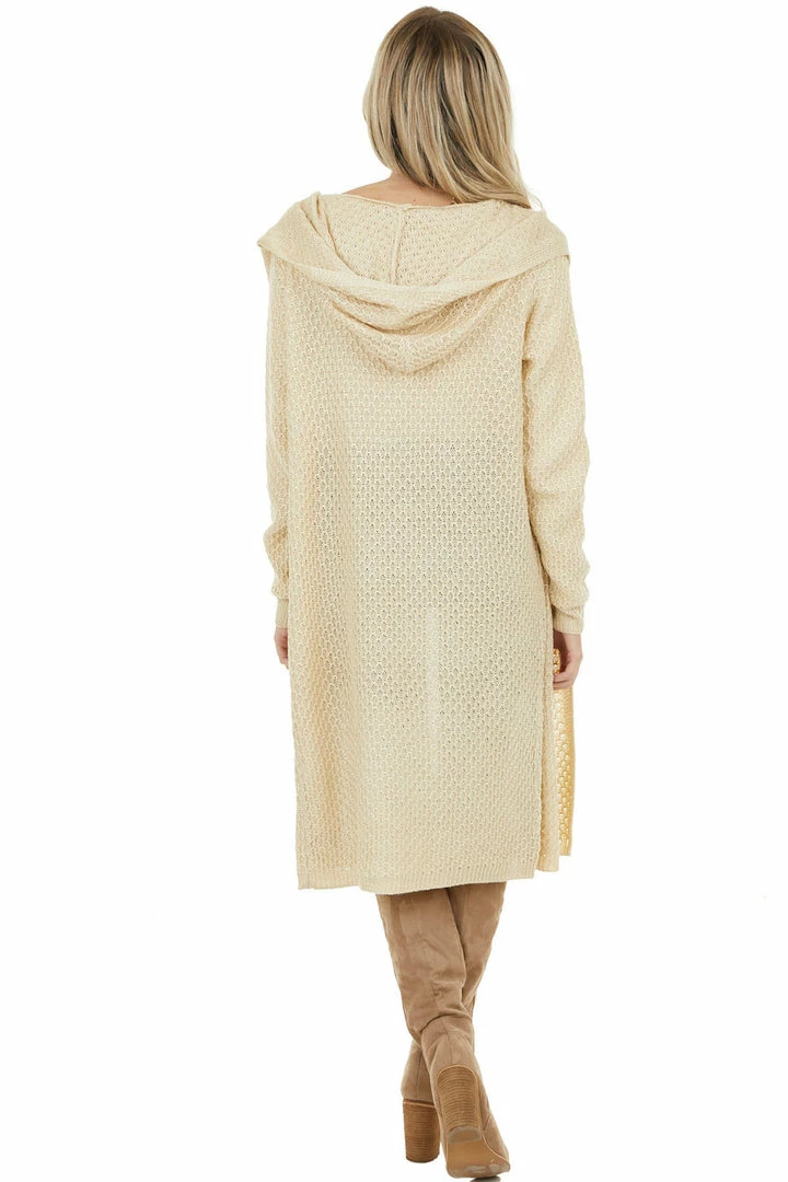 - Light Beige Textured Loose Knit Duster Cardigan with Hood
