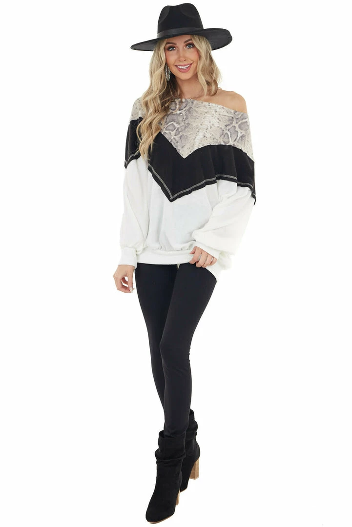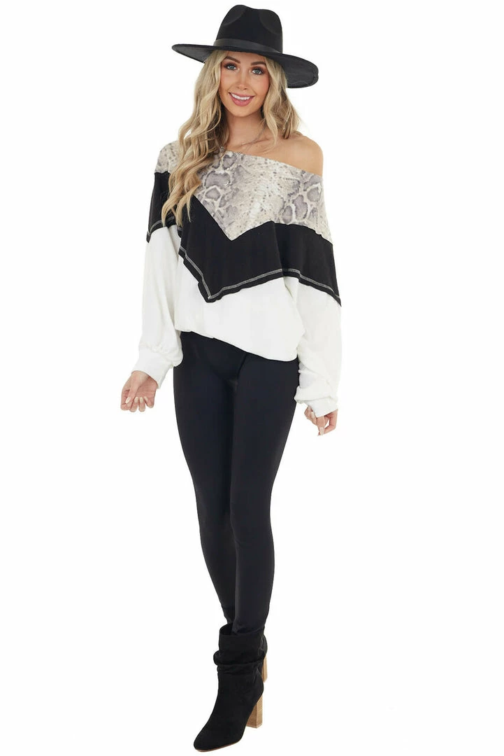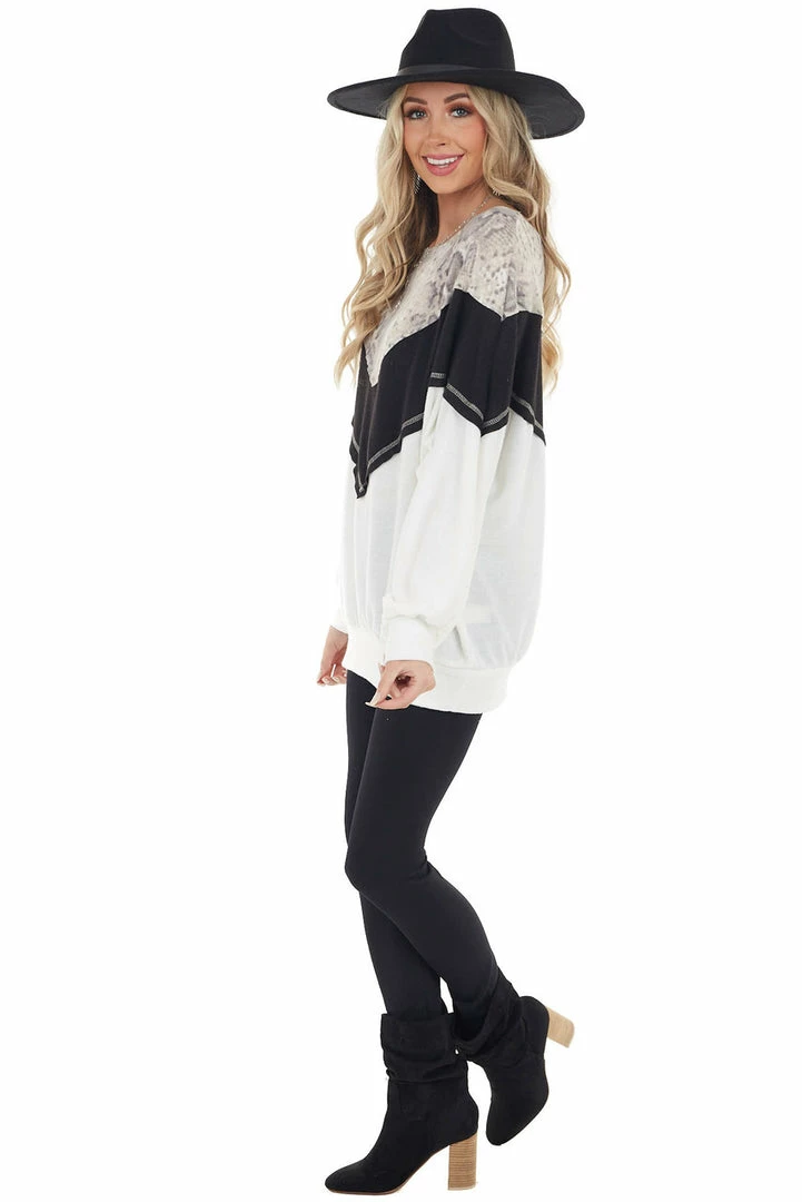 - Black and White Long Sleeve Top with Animal Print Contrast