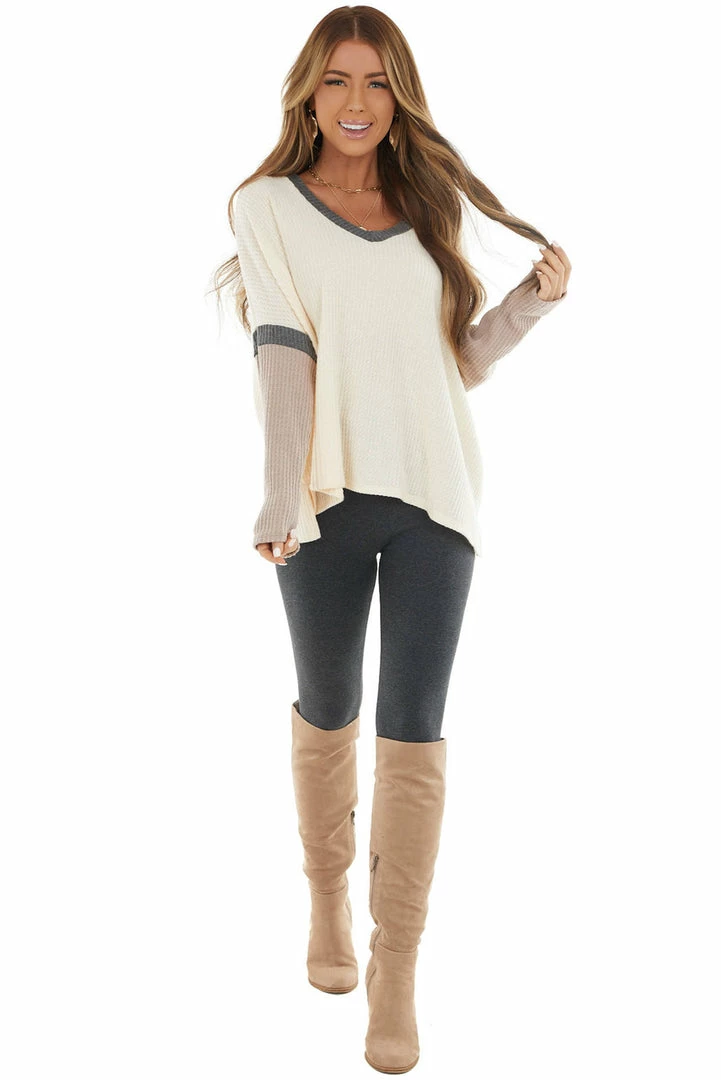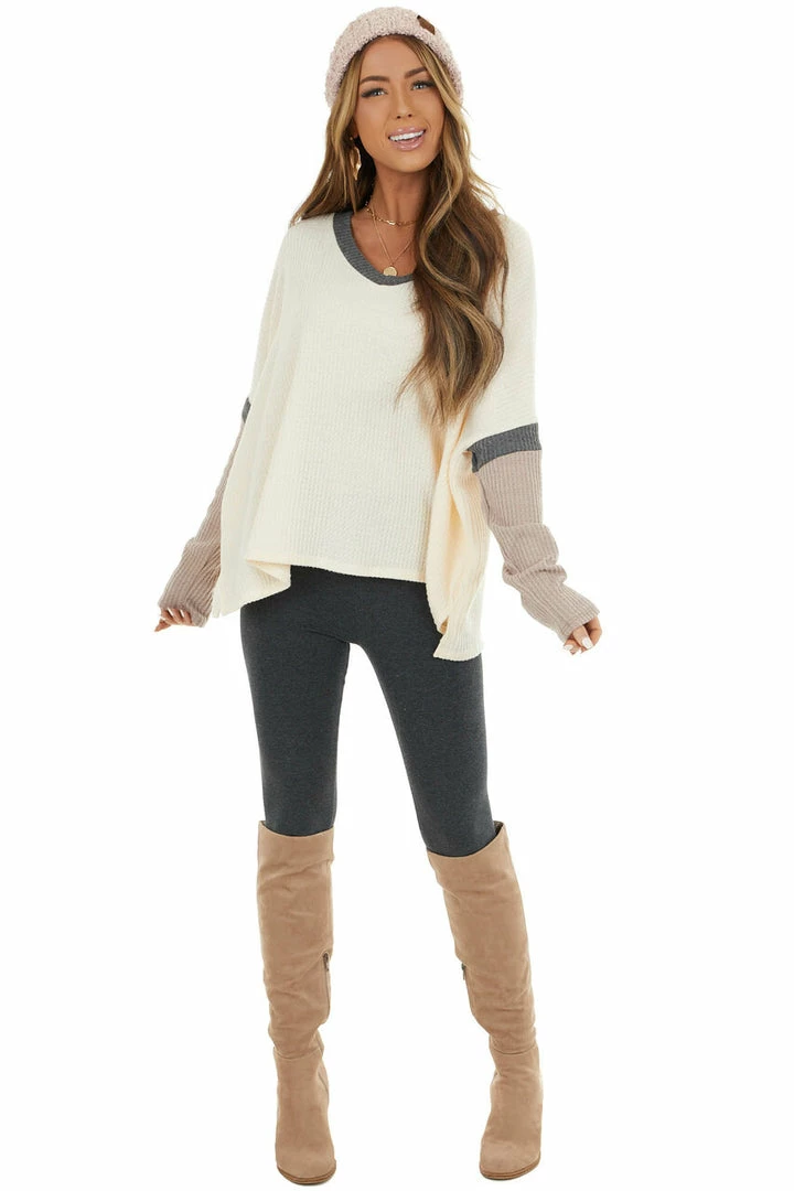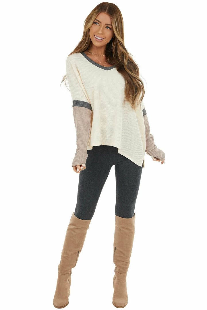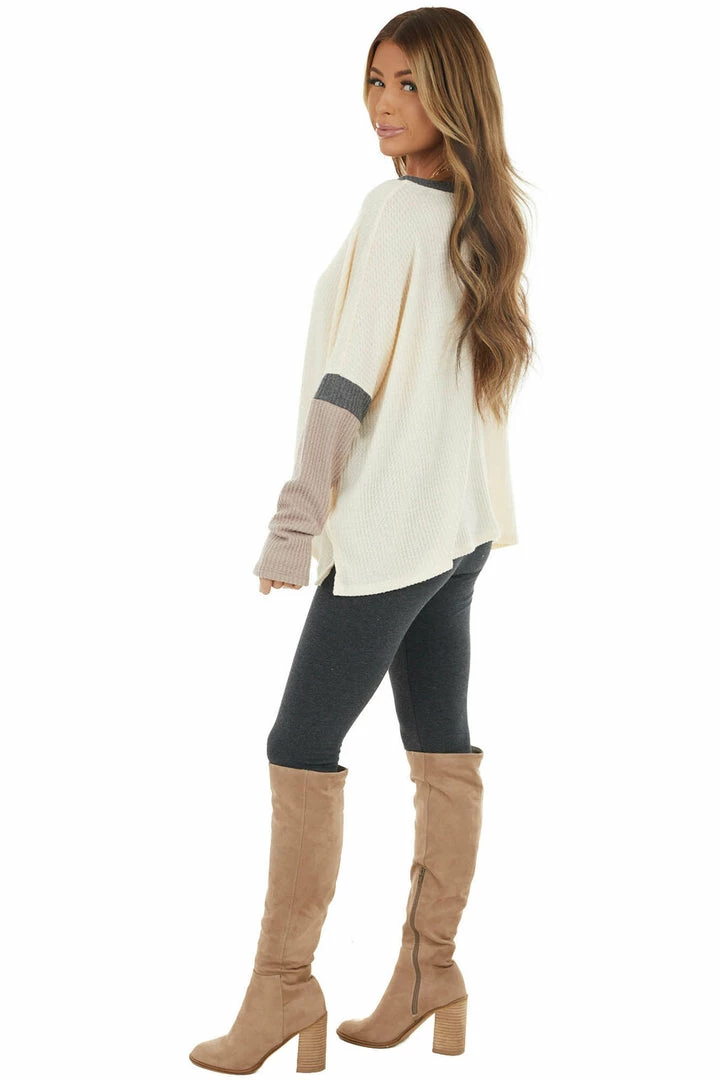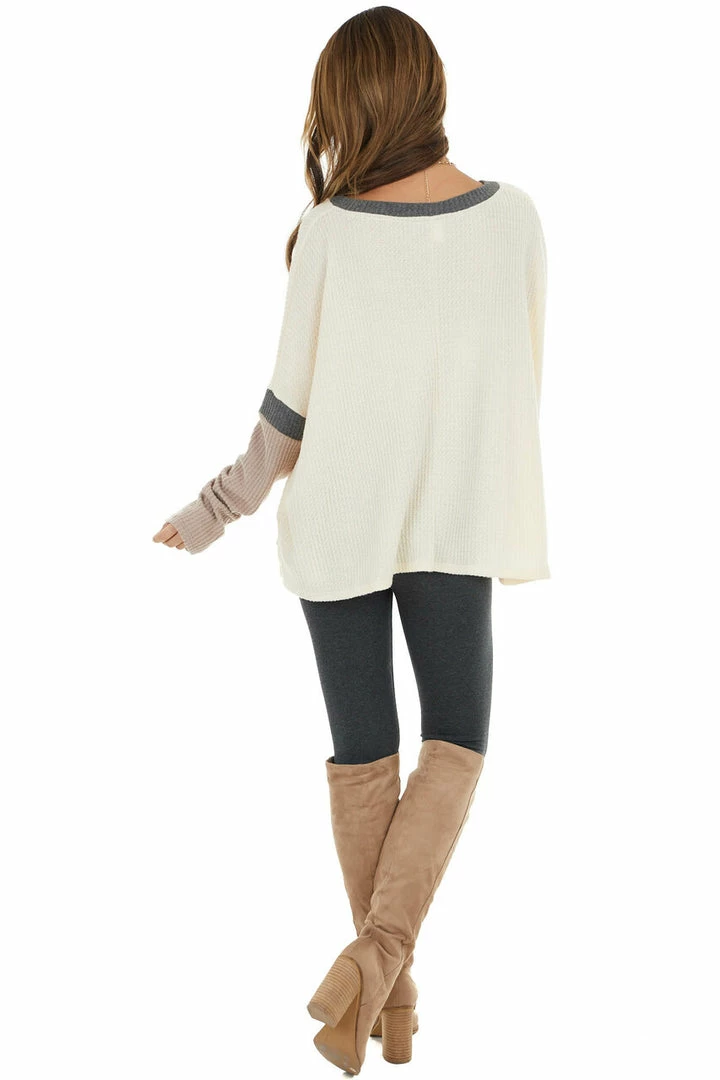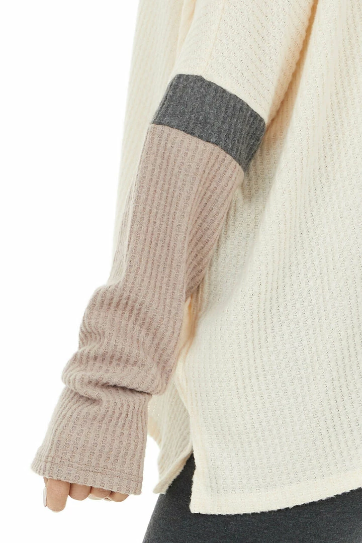 - Cream and Mauve Colorblock Long Sleeve Waffle Knit Top