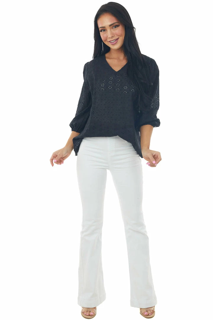 - Black 3/4 Sleeve Floral Eyelet Lace Blouse with V Neckline