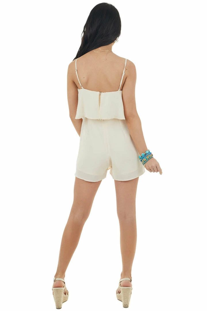 - Champagne Spaghetti Strap Flowy Overlay Romper with Pockets