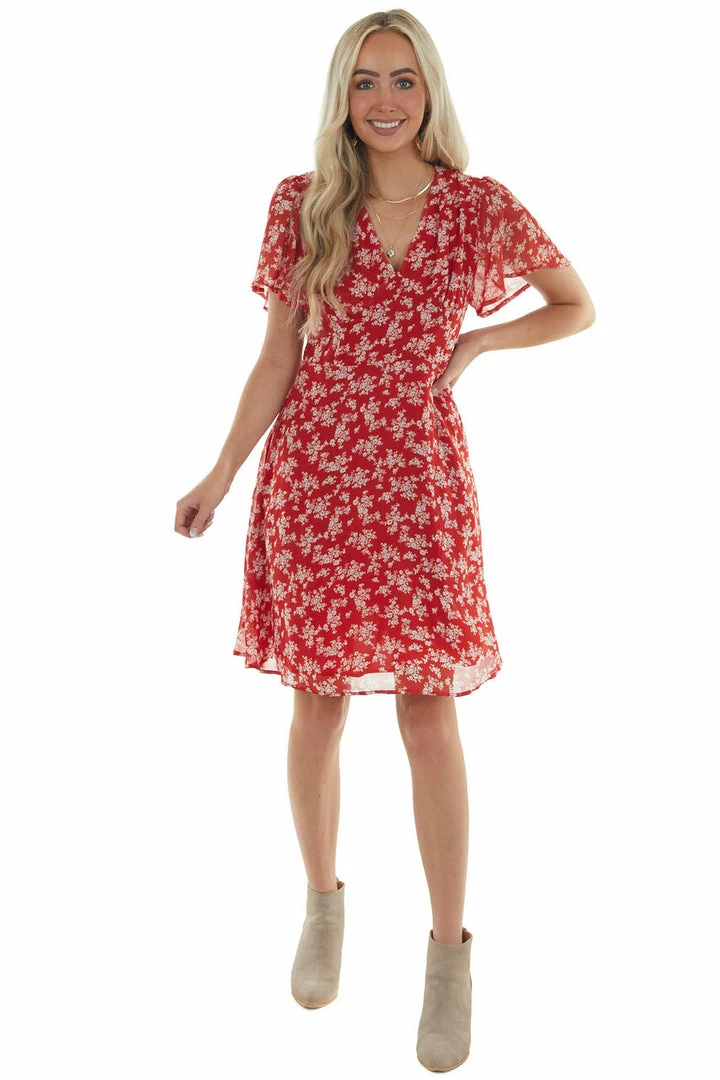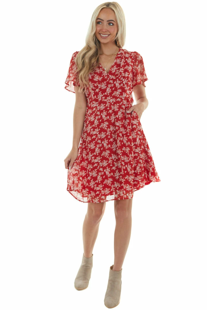 - Cranberry Floral Print V Neck Short Dress
