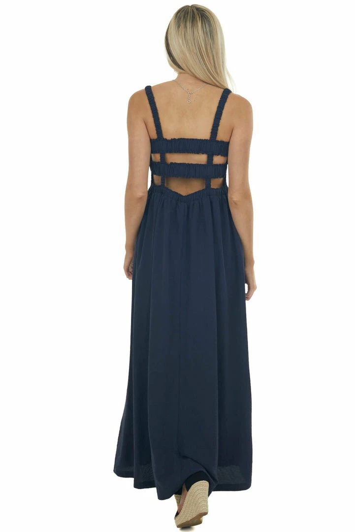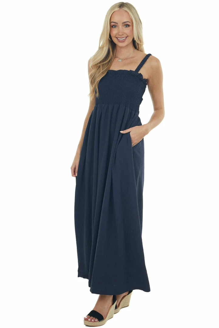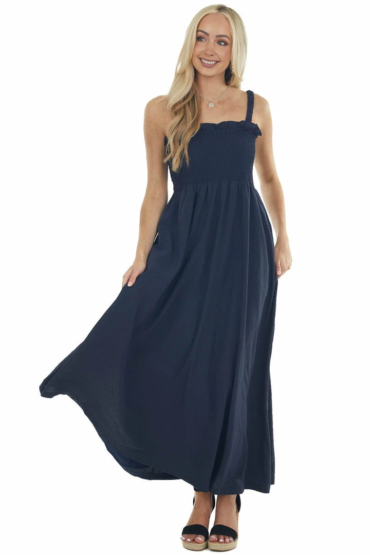 - Navy Blue Sleeveless Smocked Ruffle Maxi Dress