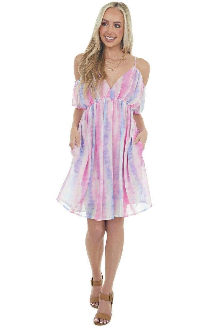 - Thulian Pink Tie Dye Cold Shoulder Mini Dress