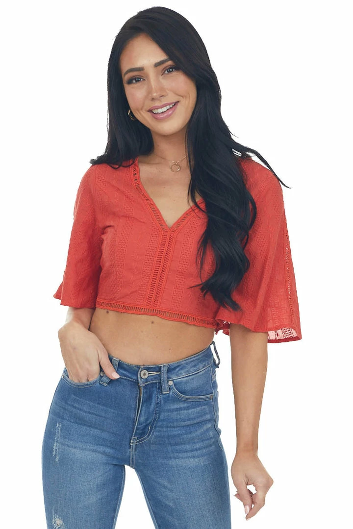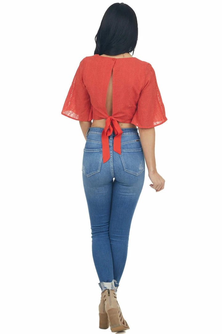- Lipstick Red Flare Sleeve Open Back Woven Crop Top