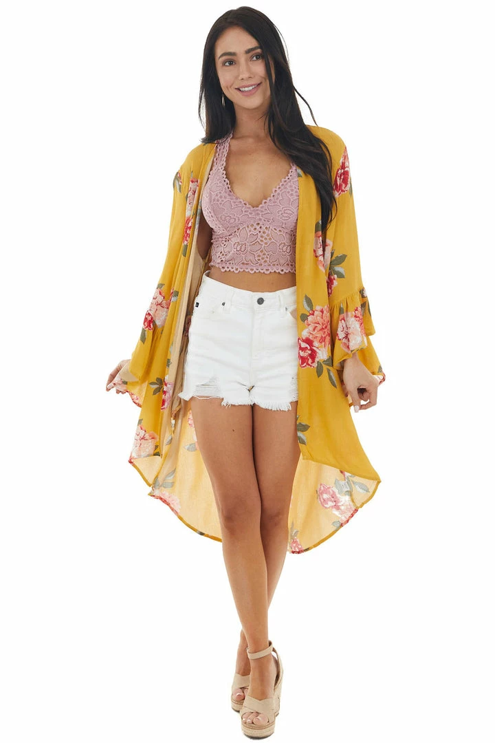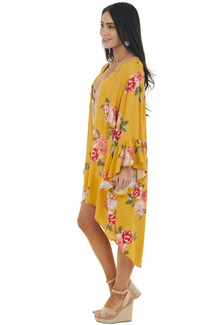 - Mustard Yellow Floral Print Kimono with Flare Sleeves