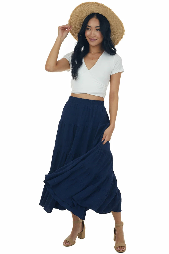 - Navy Tiered Ruffle Hem Elastic Midi Skirt