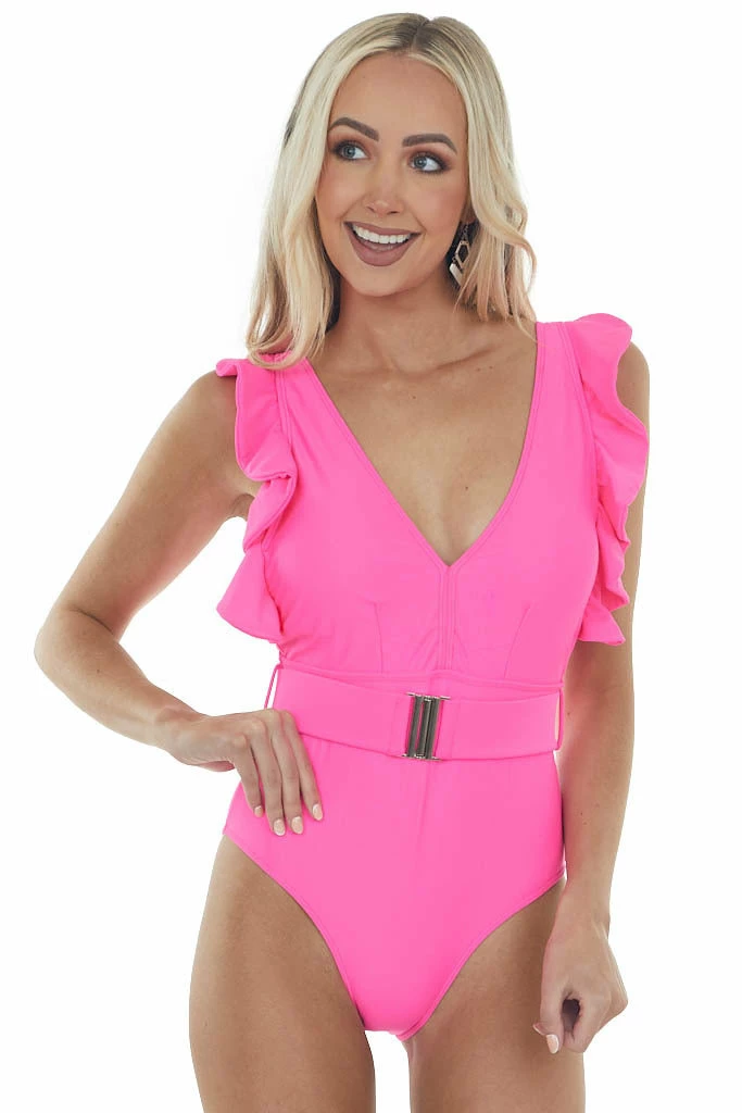 - Neon Pink Ruffle Strap Belted V Neck Swimsuit