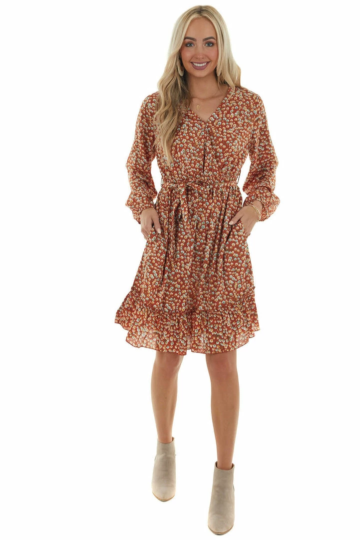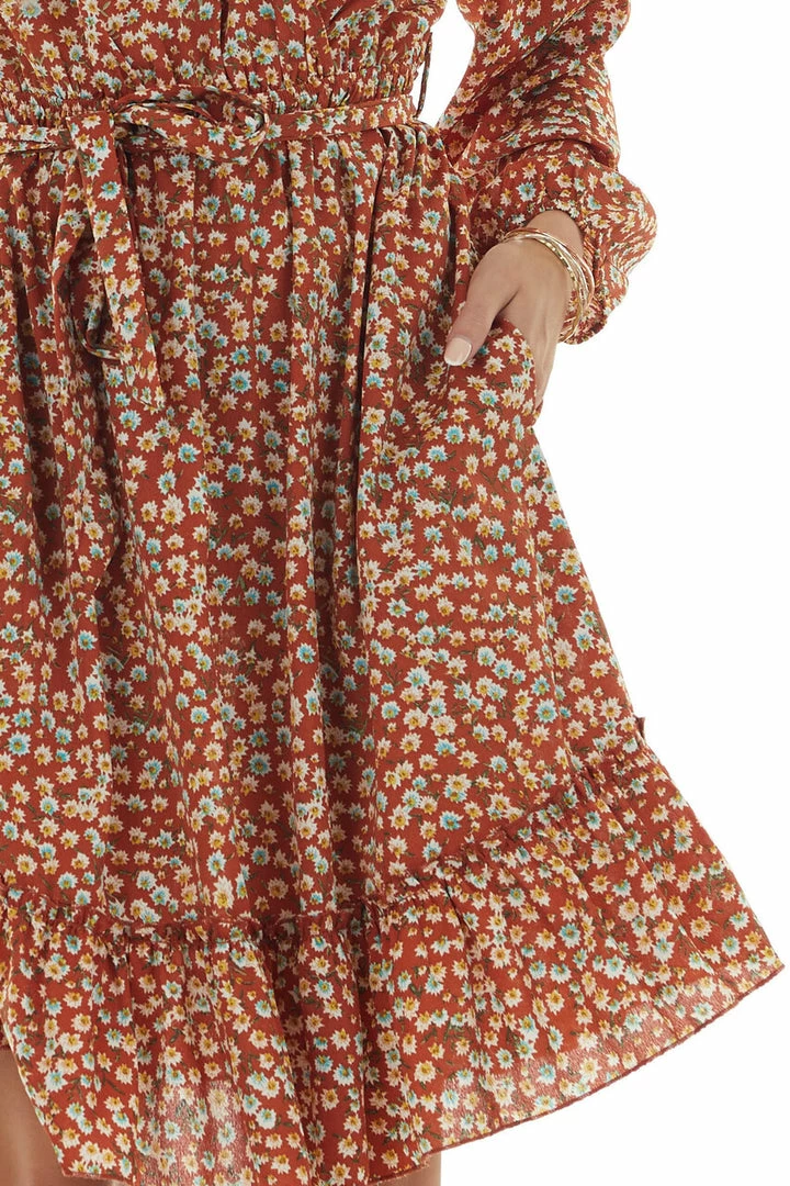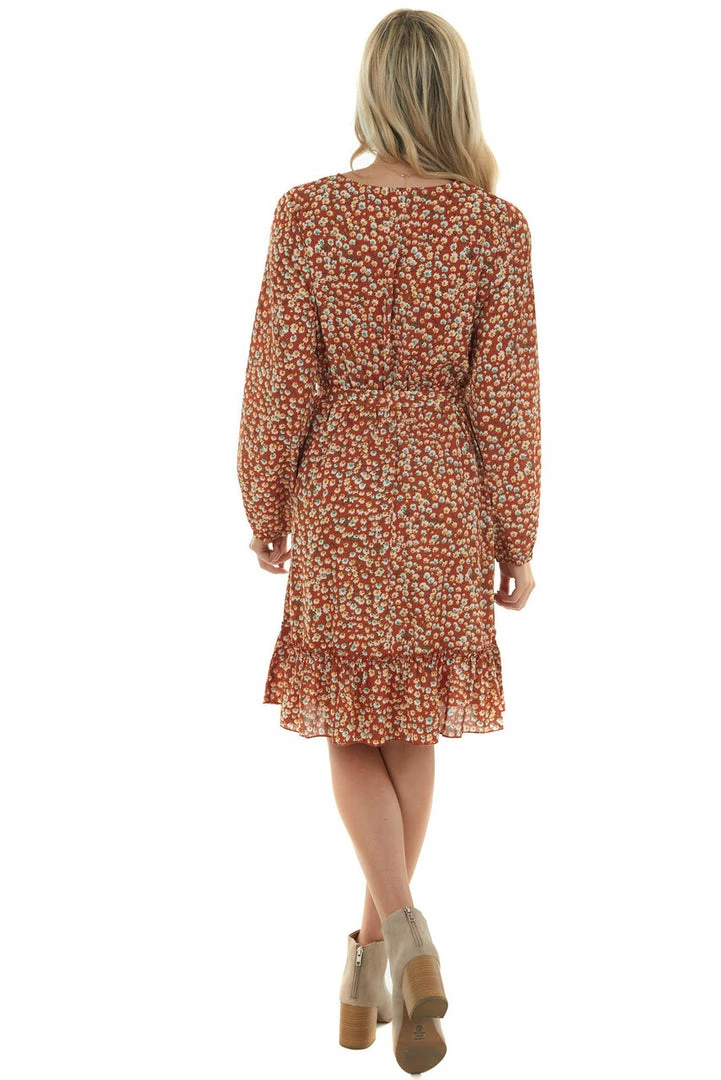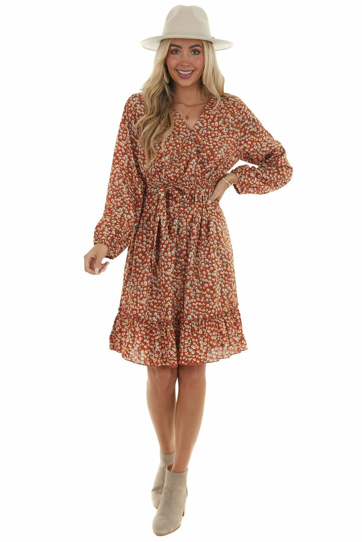 - Rust Floral Long Sleeve Surplice Neck Dress