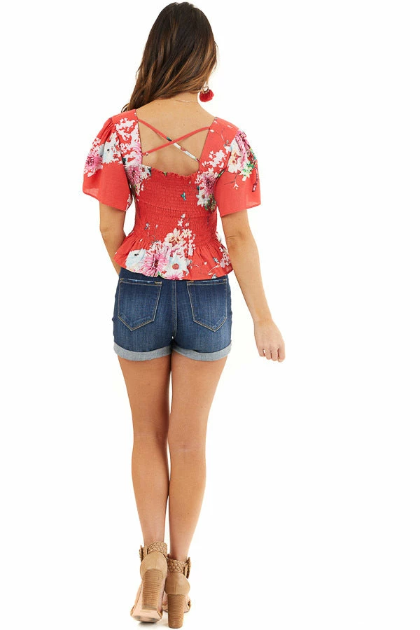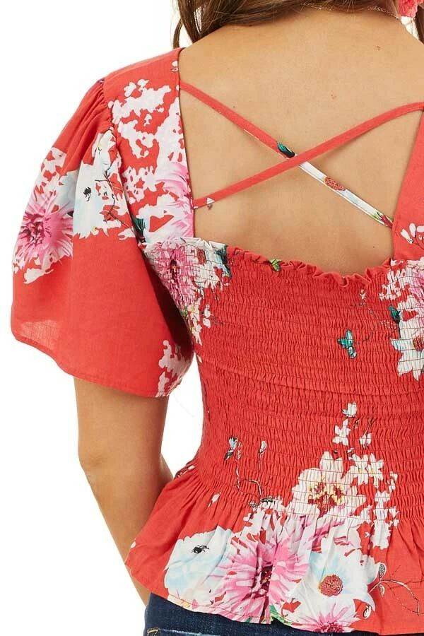 - Tomato Red Floral Print Smocked Crop Top with Short Sleeves