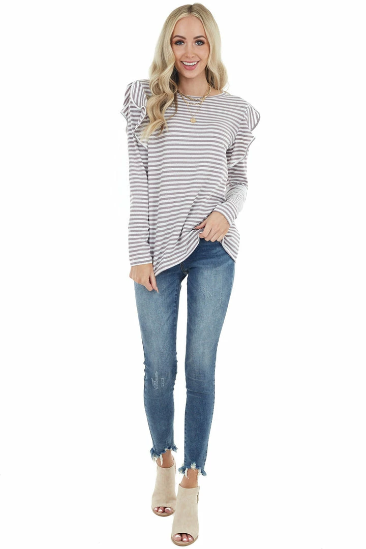 - Mocha and Ivory Striped Long Sleeve Top with Ruffle Detail