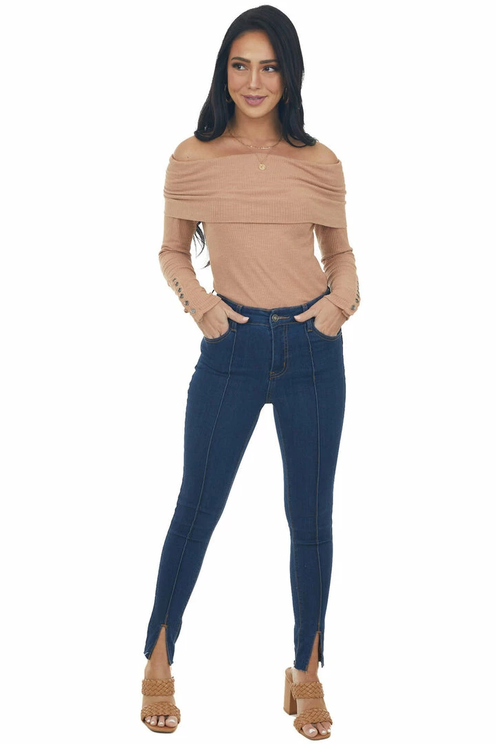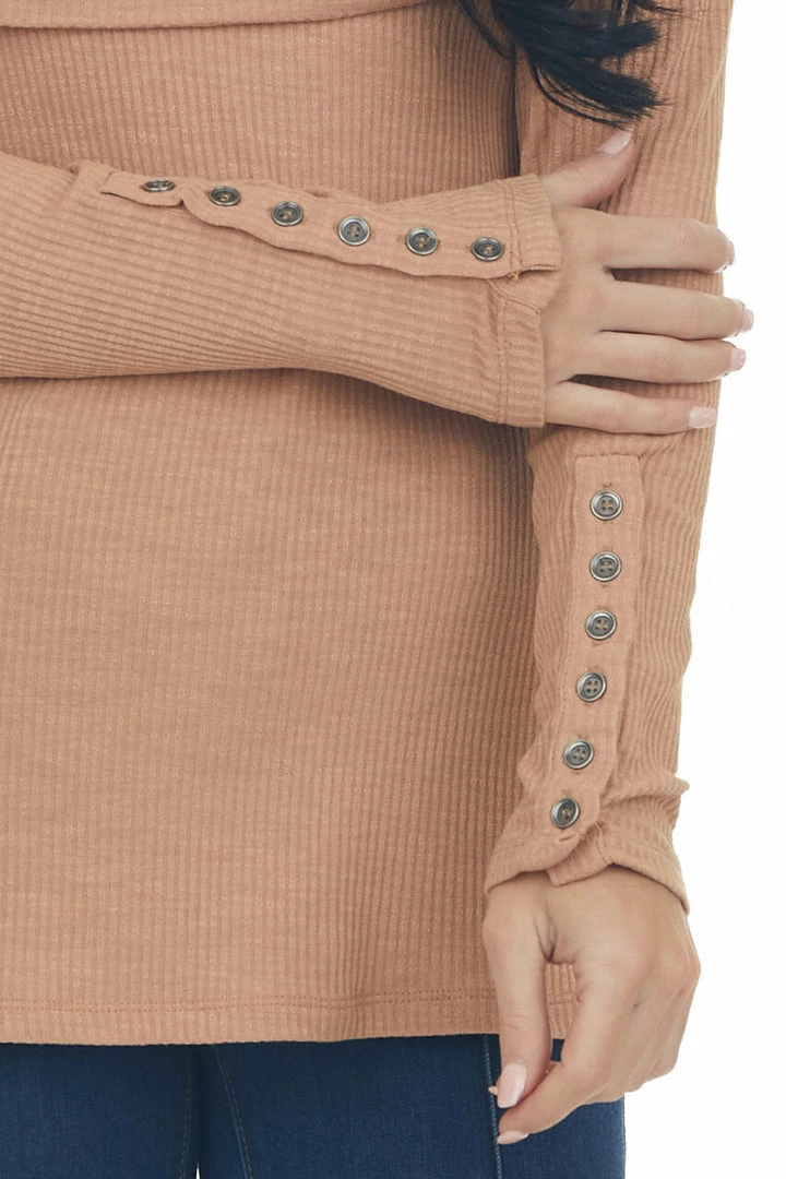 - Dark Apricot Ribbed Knit Folded Off the Shoulder Top