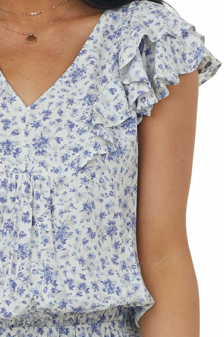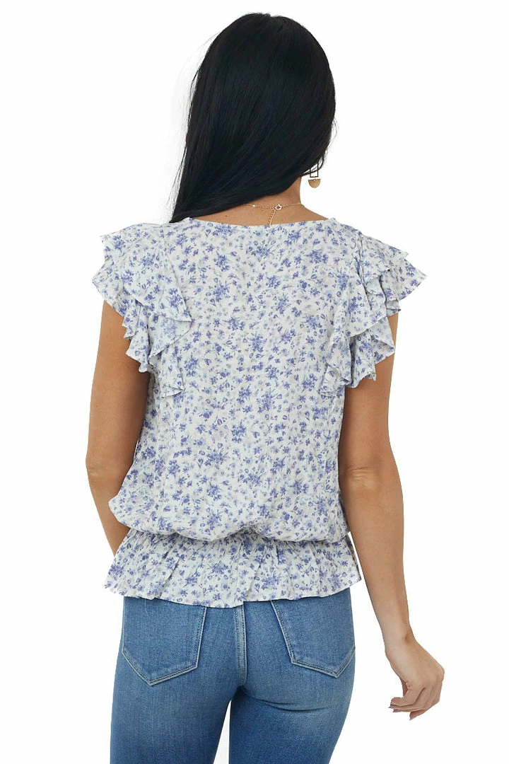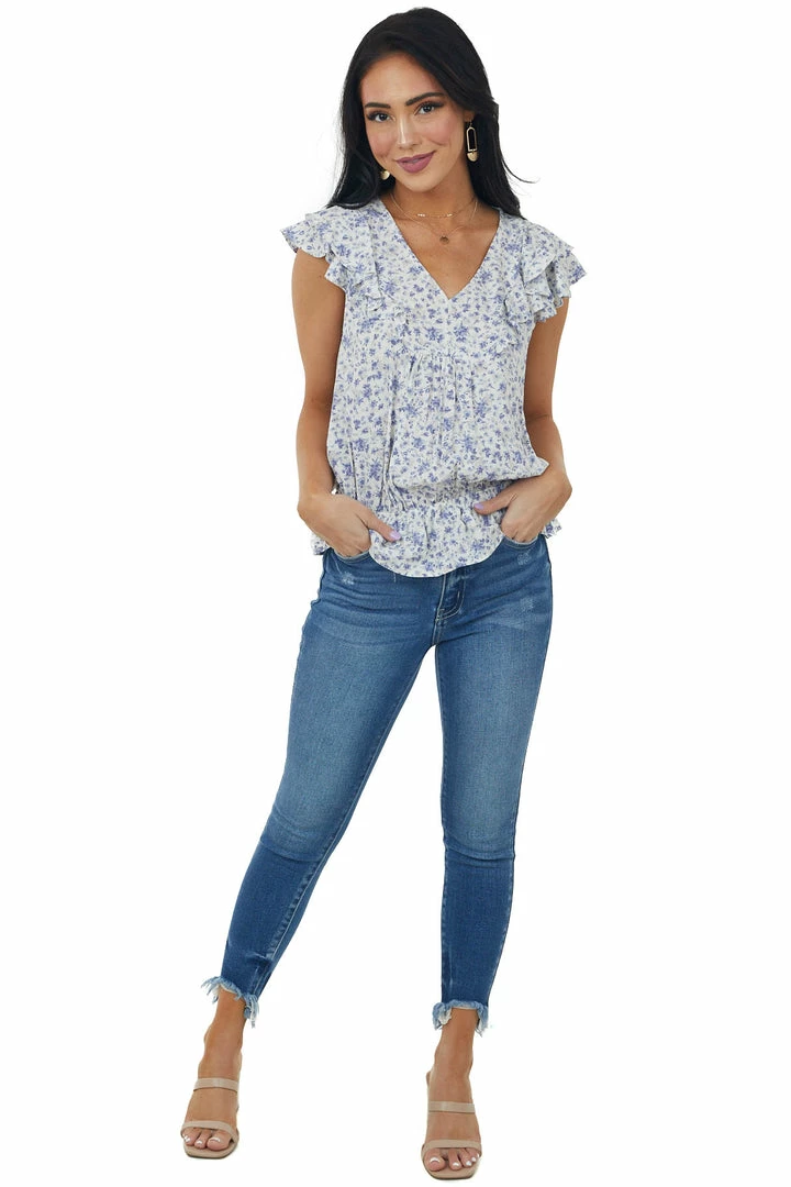 - Ivory Ditsy Floral V Neck Ruffle Sleeve Blouse