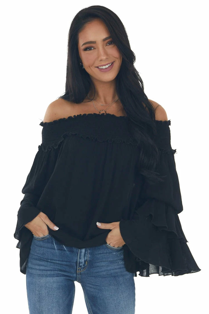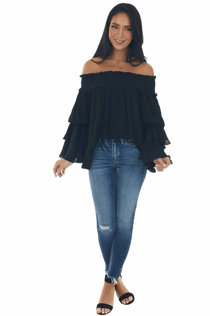 - Black Off Shoulder Tiered Ruffle Sleeve Top