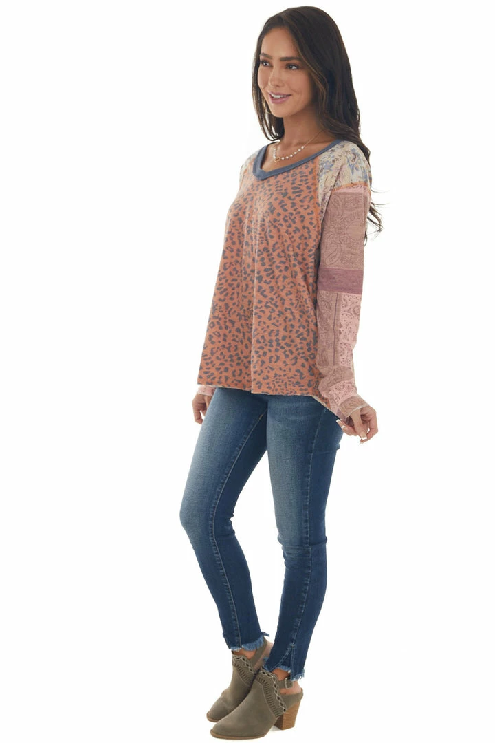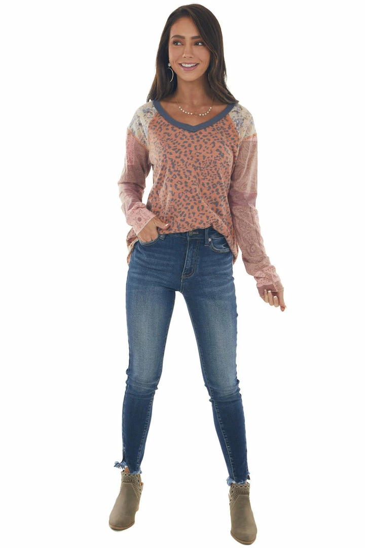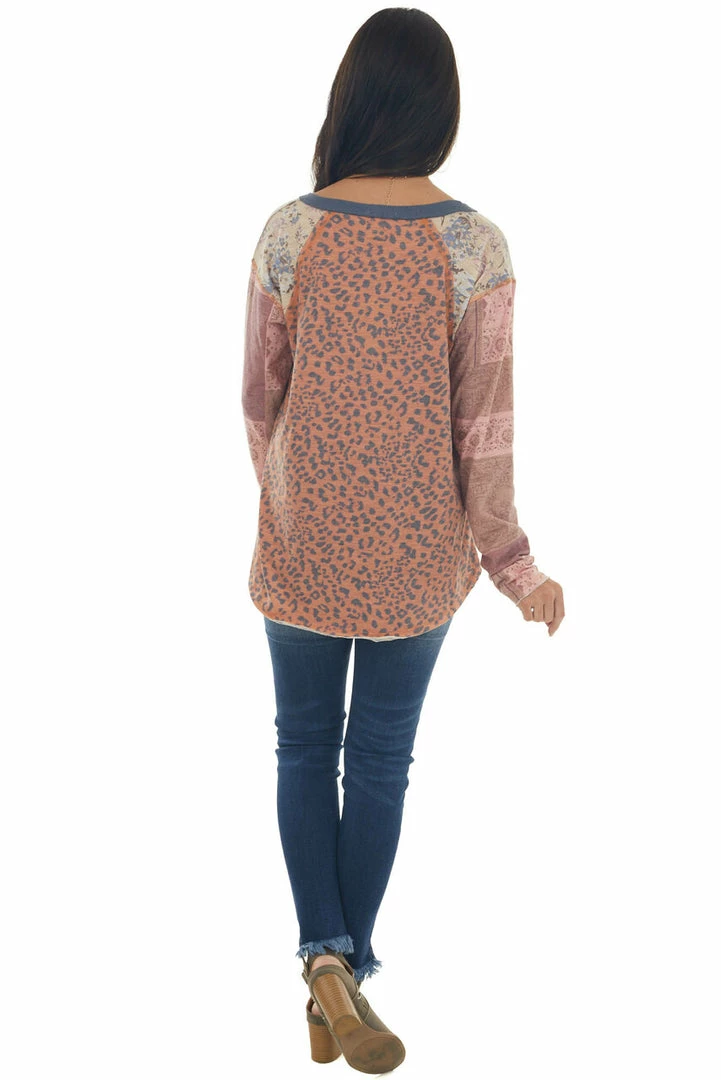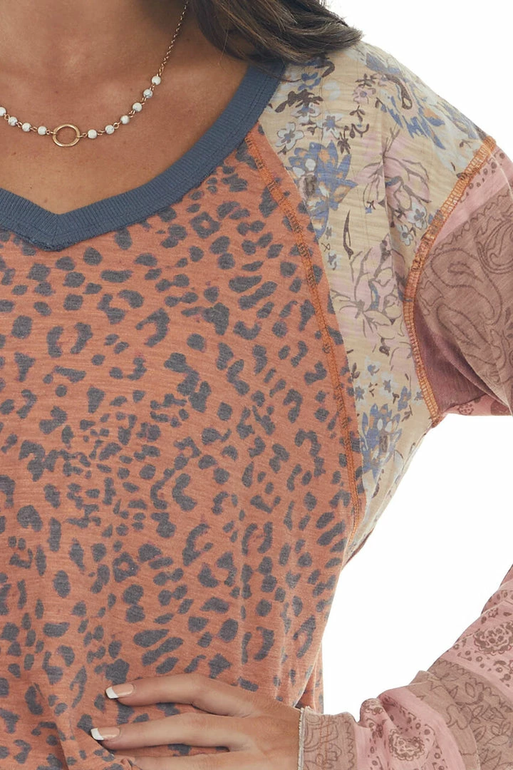 - Rust Multiprint Knit Top with Raw Edge Detail