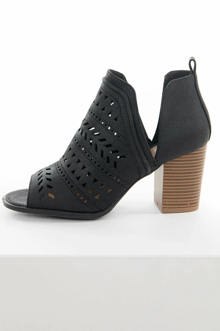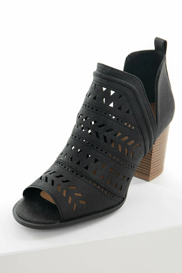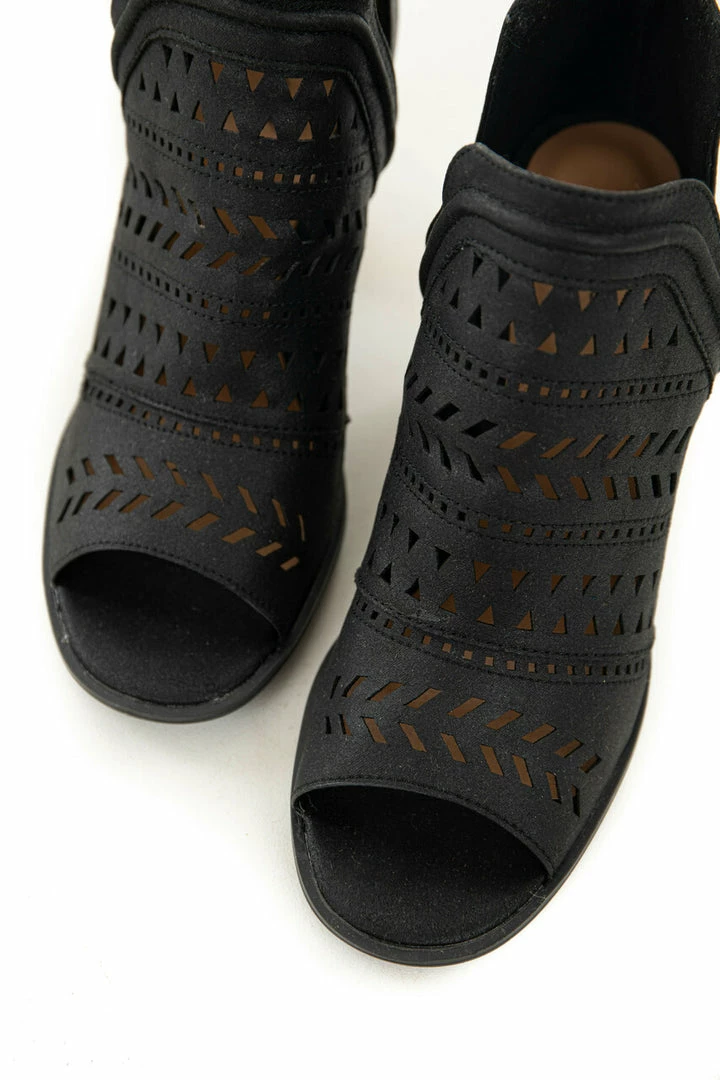 - Black faux leather upper with laser cut out details