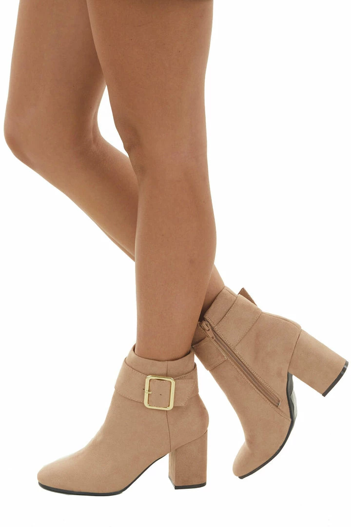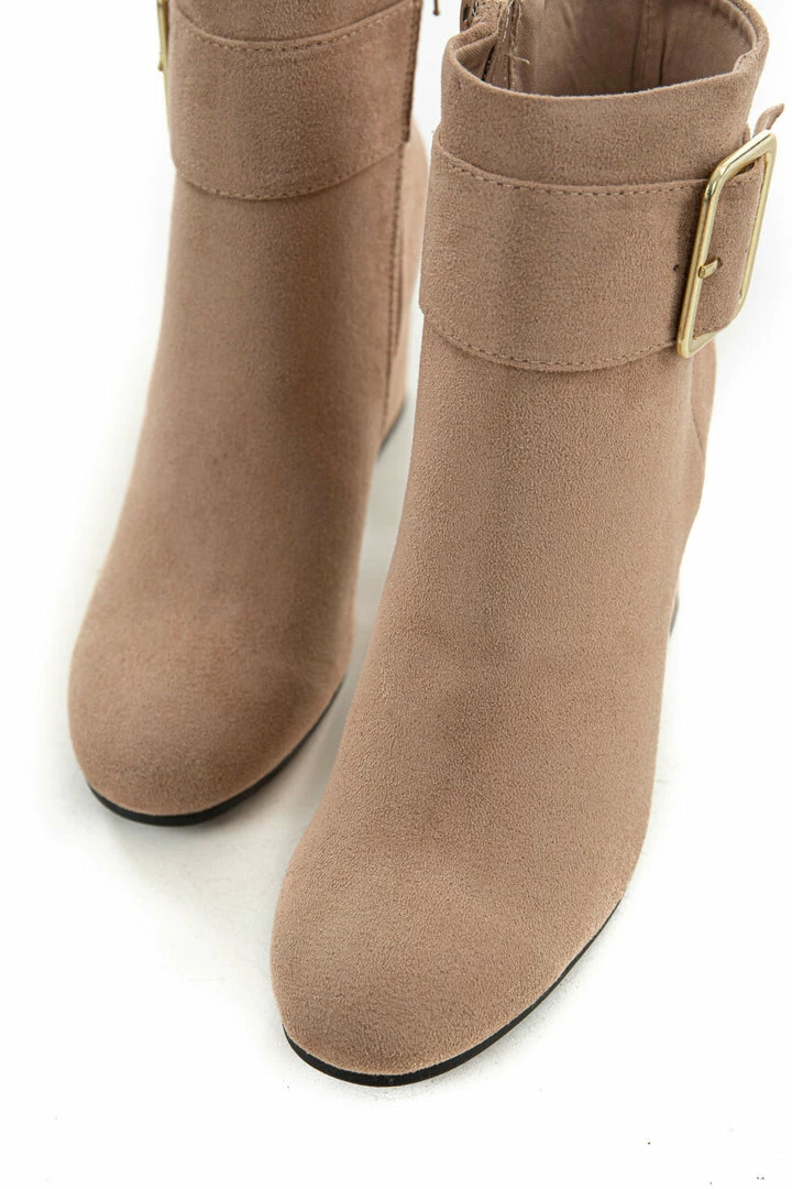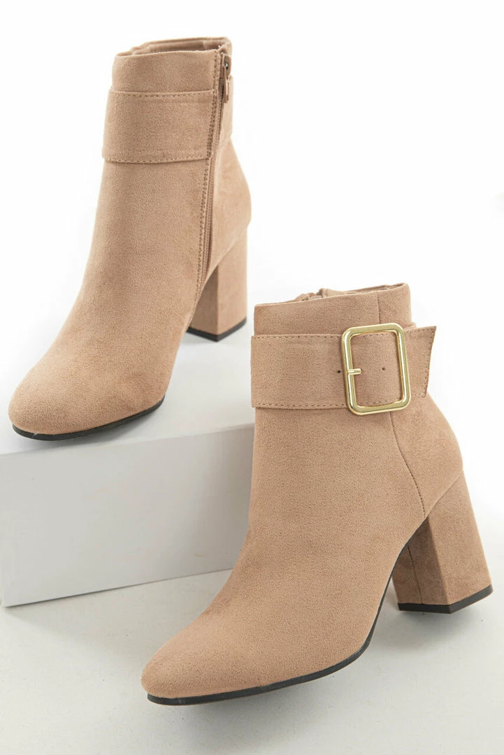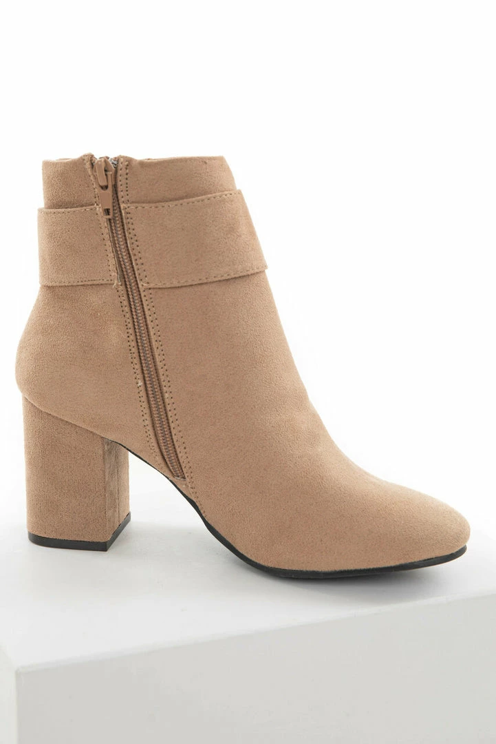 - Latte Block High Heel Zip Up Suede Booties with Round Toe