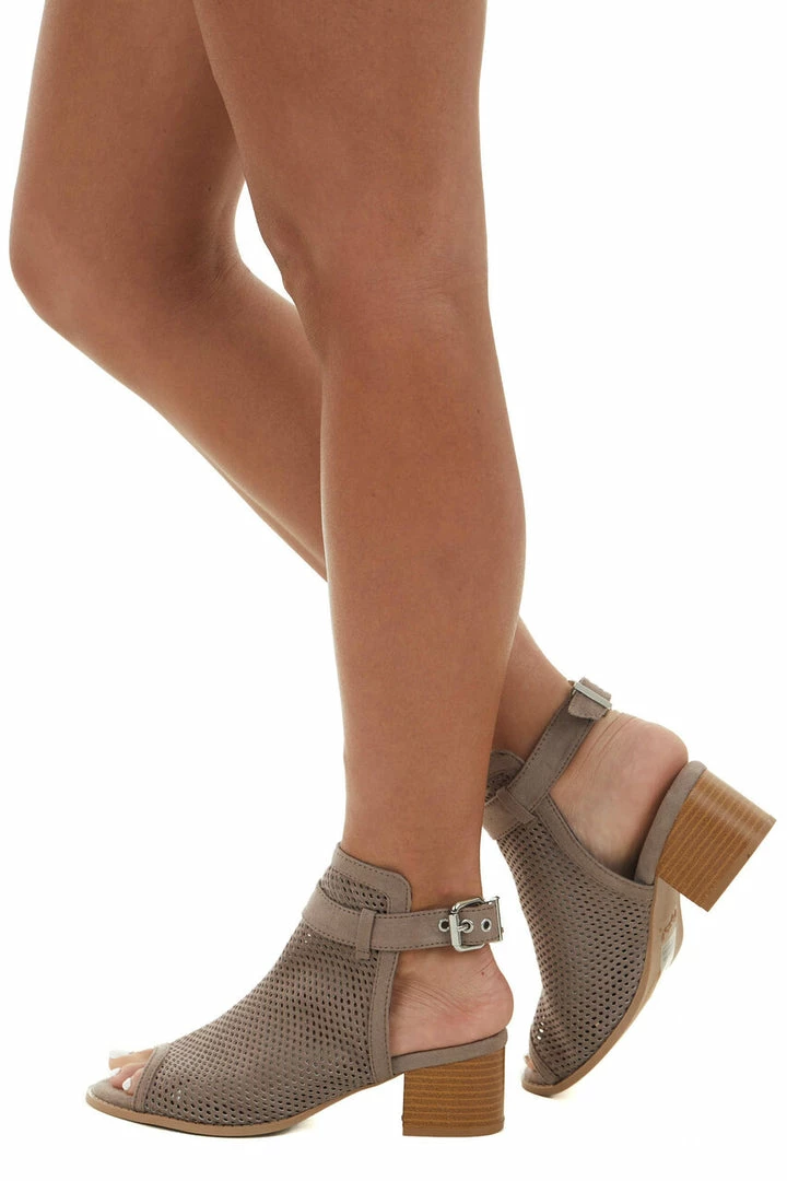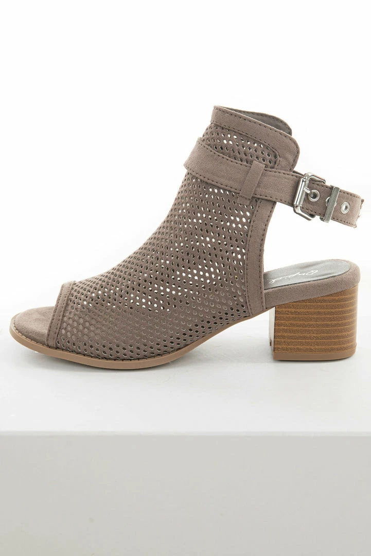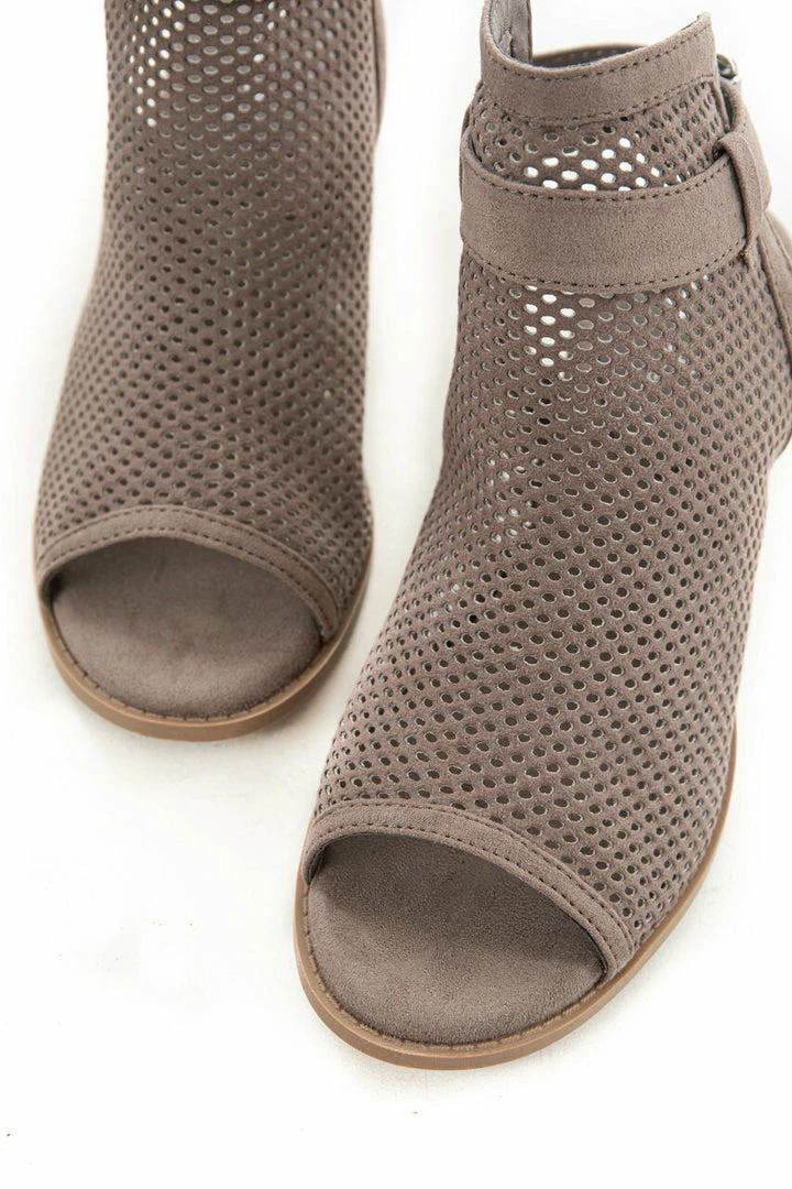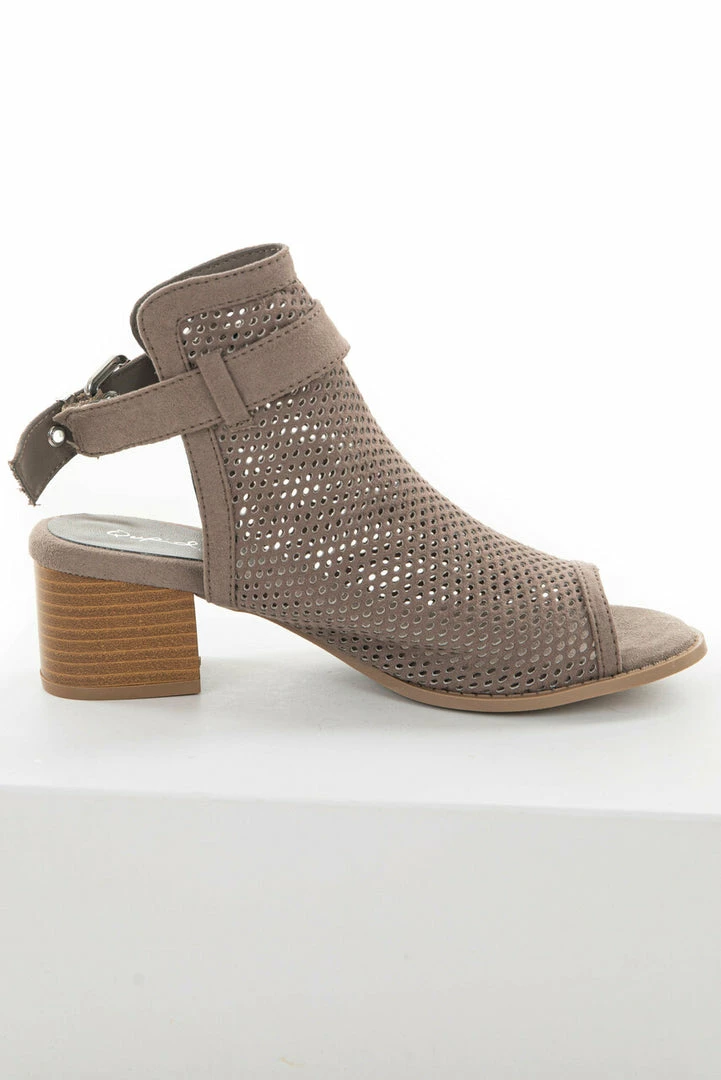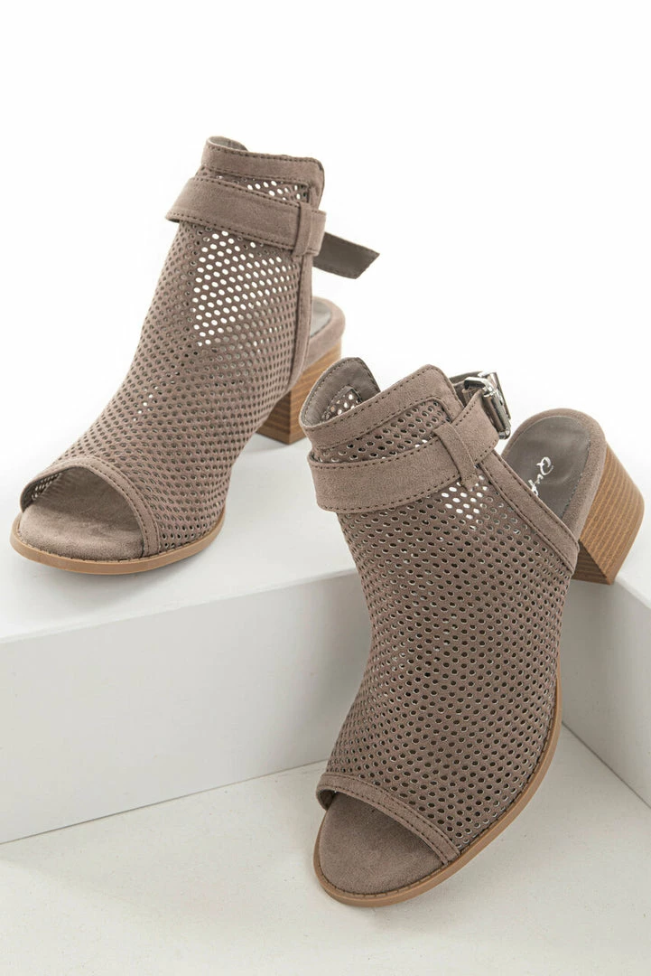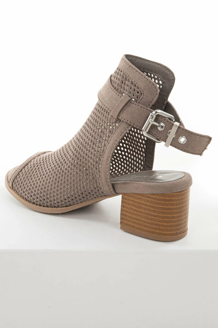 - Taupe Stacked Heel Perforated Mule Booties