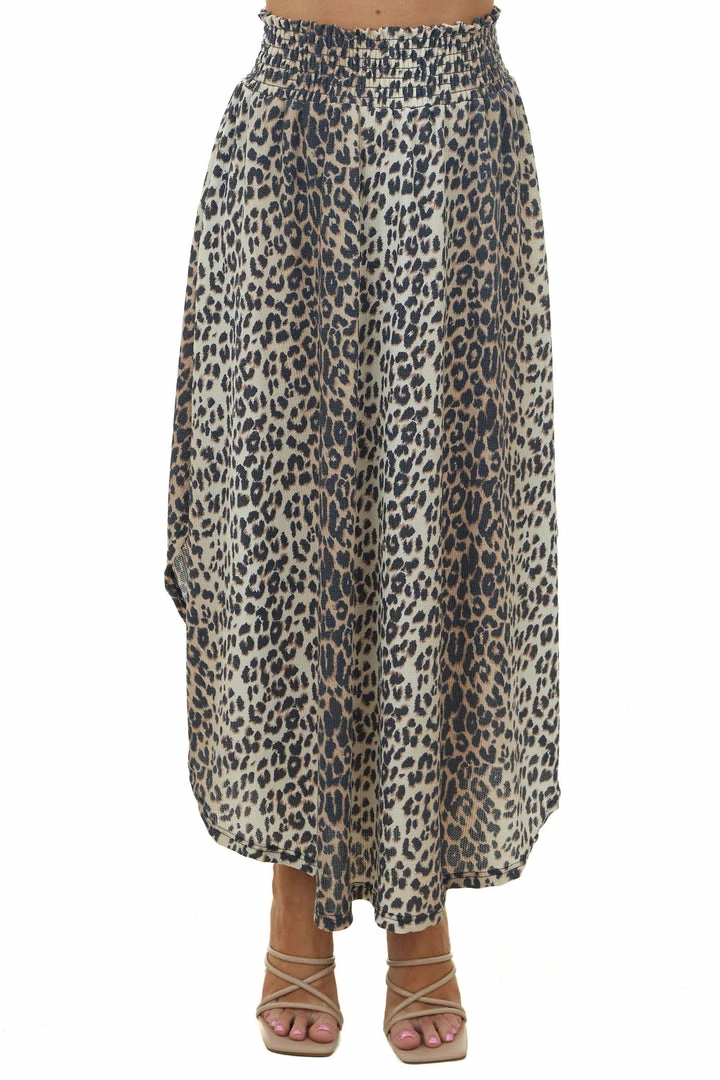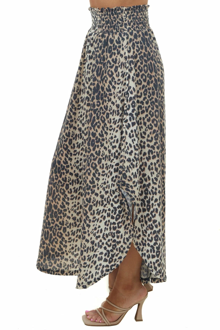 - Beige Leopard Print Waffle Knit Maxi Skirt with Side Slits