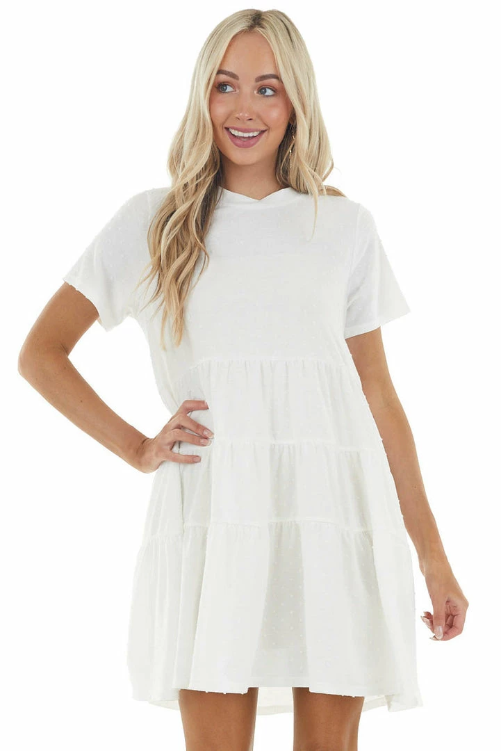 - Off White Drop Waist Swiss Dot Knit Dress with Tiered Detail