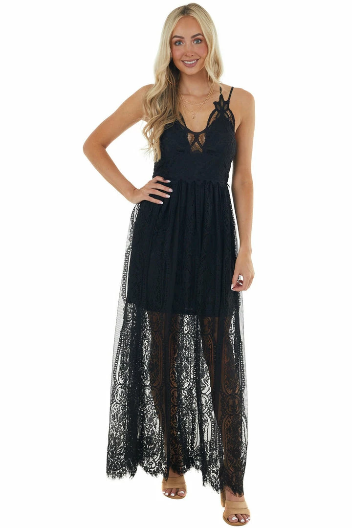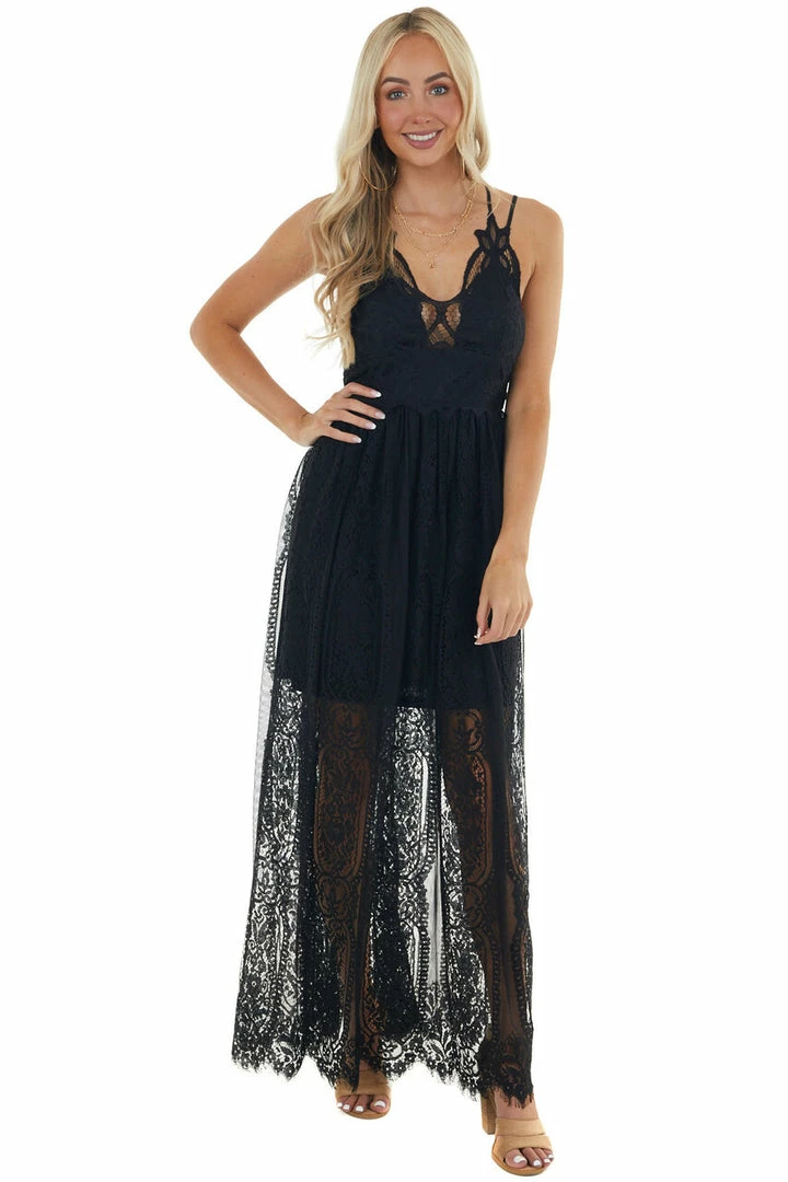 - Black Lace Maxi Overlay Sleeveless Dress with Plunging Neck