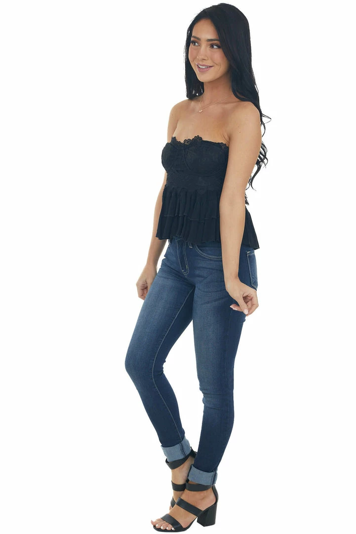 - Black Tiered Ruffle Strapless Lace Woven Top