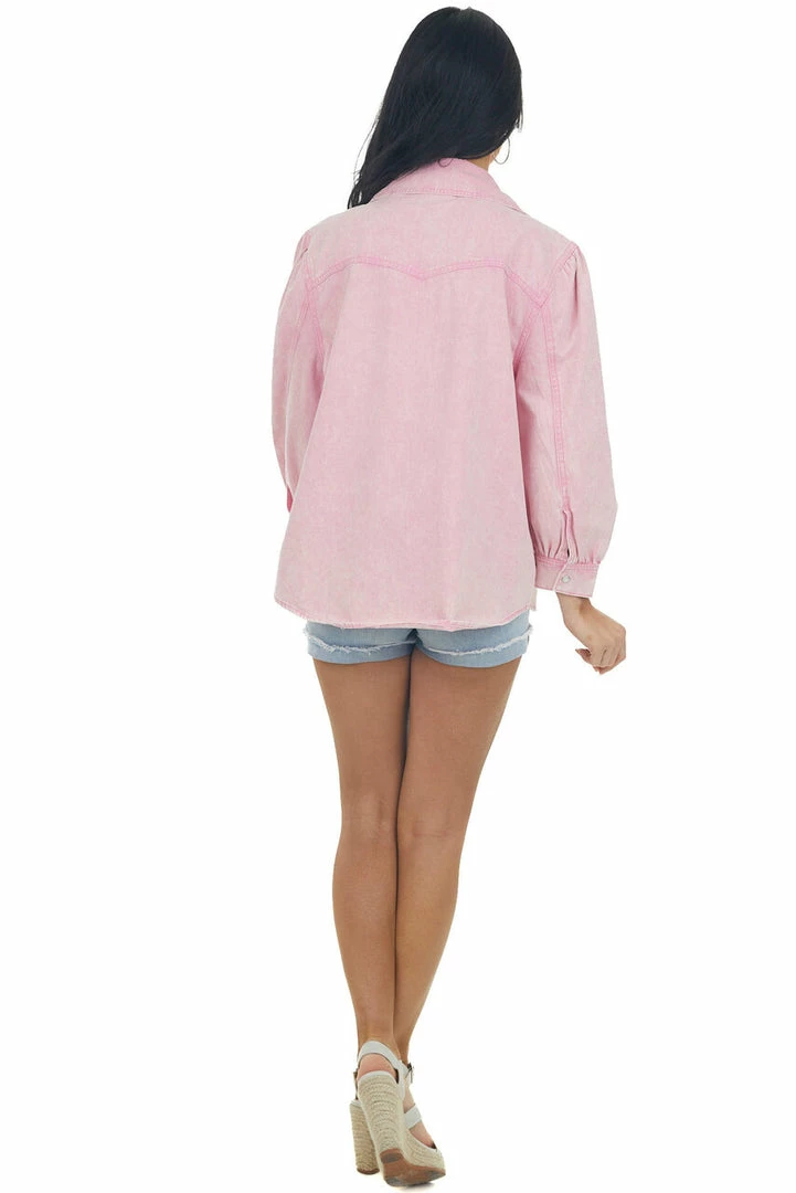 - Bubblegum Acid Wash Button Down Denim Shirt