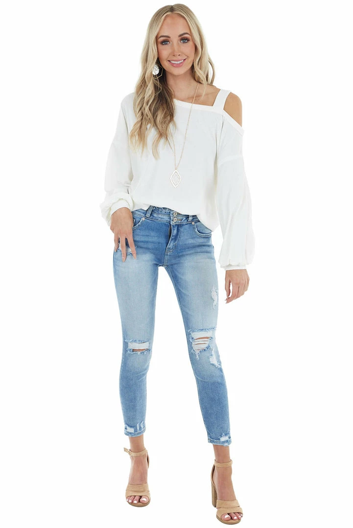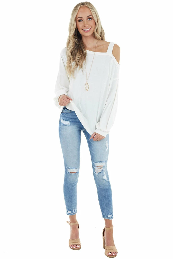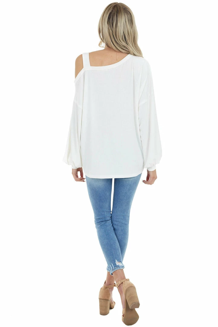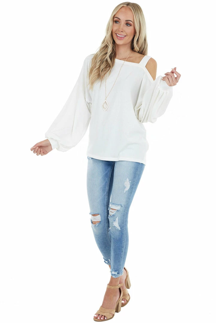 - Cream Bubble Sleeve Top with Single Strap Cold Shoulder