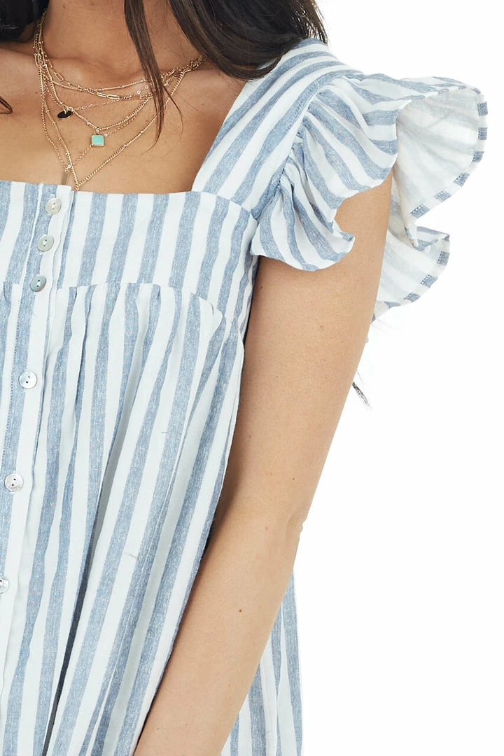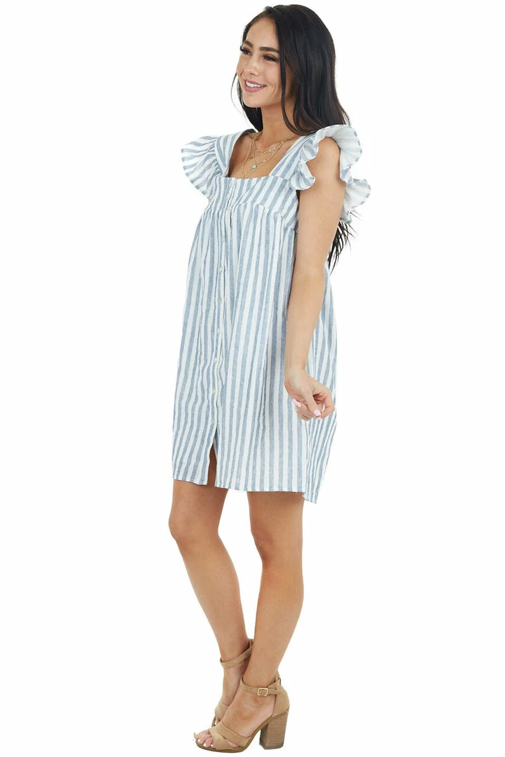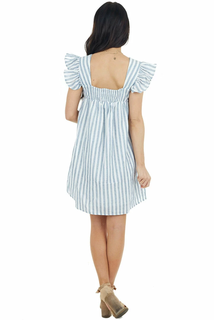 - Denim and Ivory Stripe Print Mini Dress with Ruffle Straps