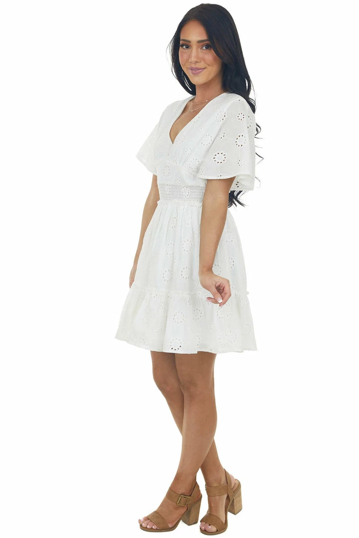 - Off White Eyelet Lace Smocked Waist Mini Dress