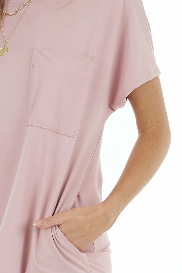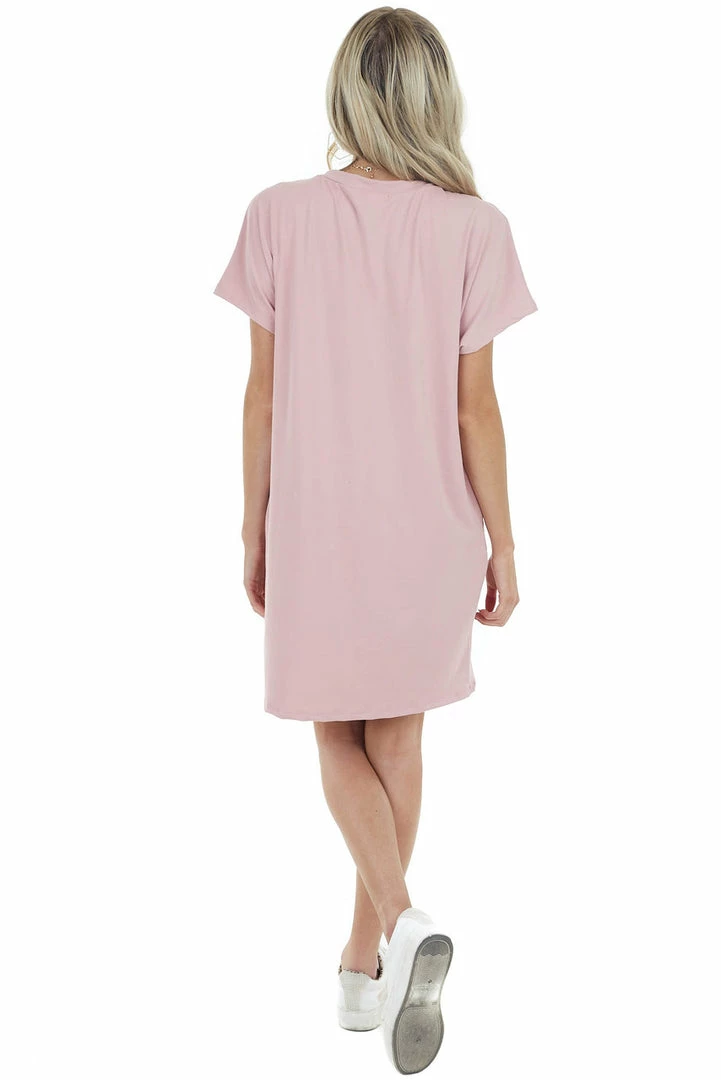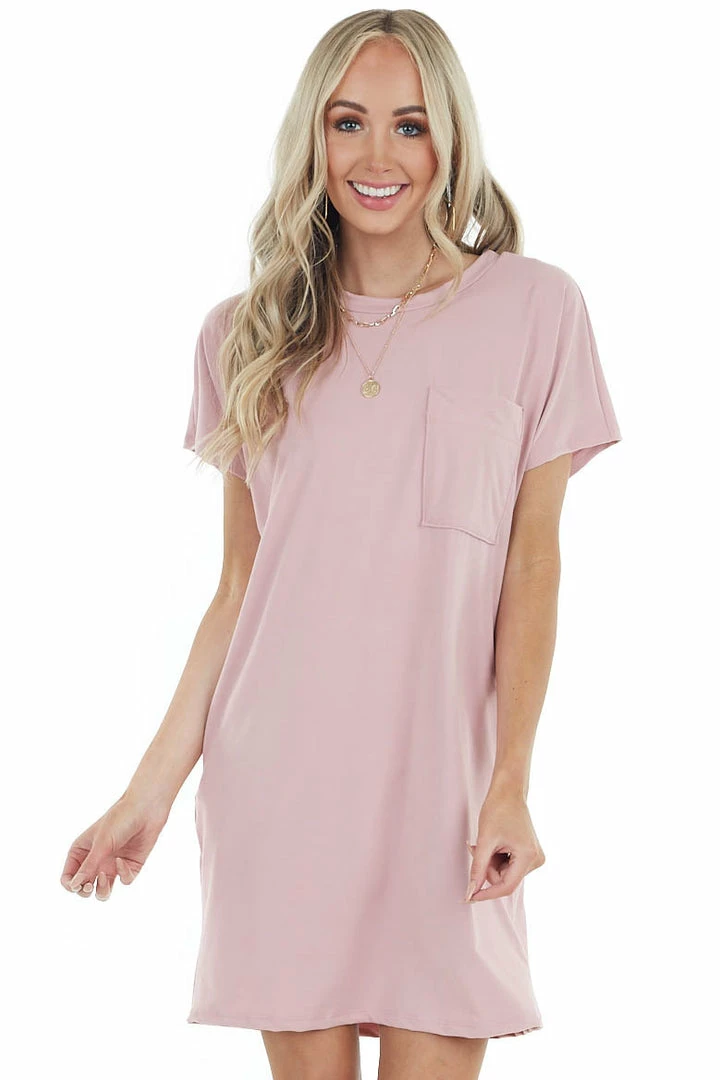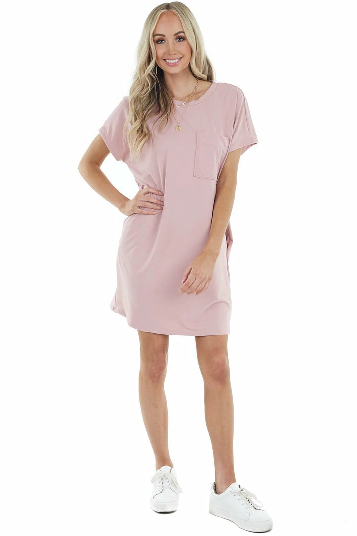 - Dusty Blush Short Sleeve Tee Shirt Dress with Front Pocket