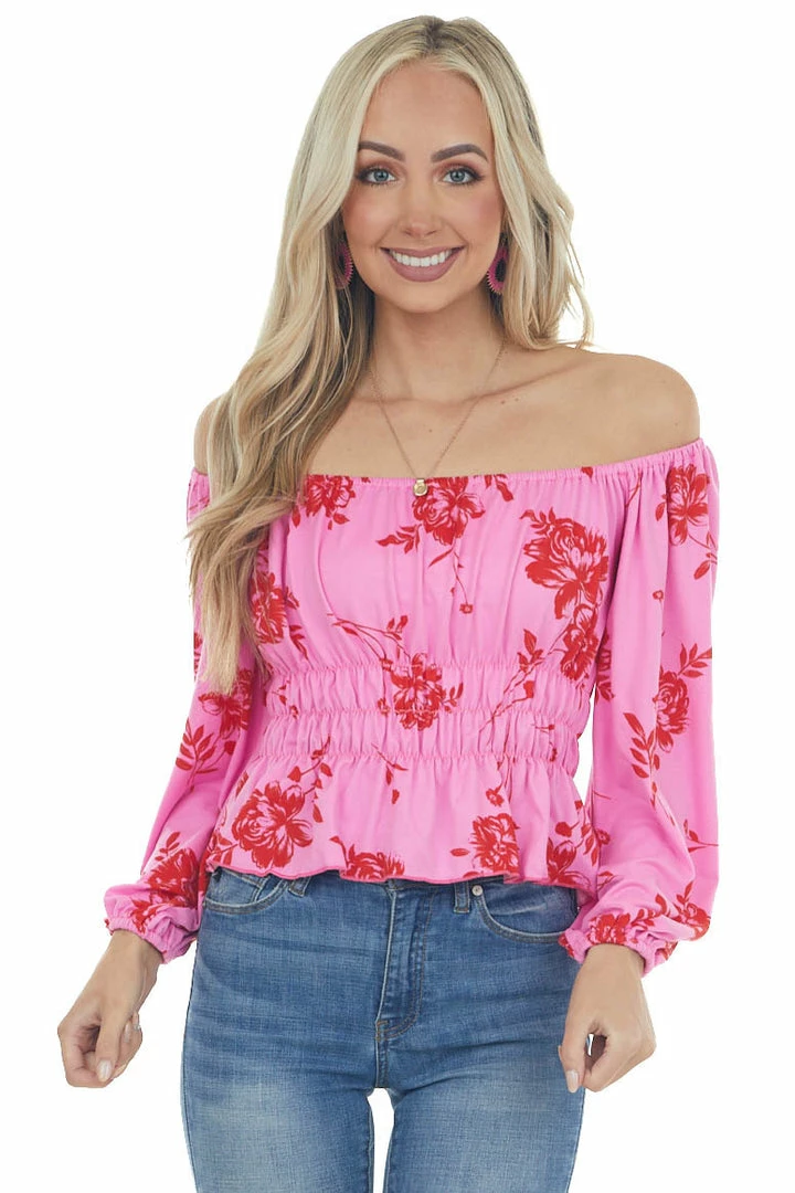 - Hot Pink and Red Floral Print Off the Shoulder Knit Top