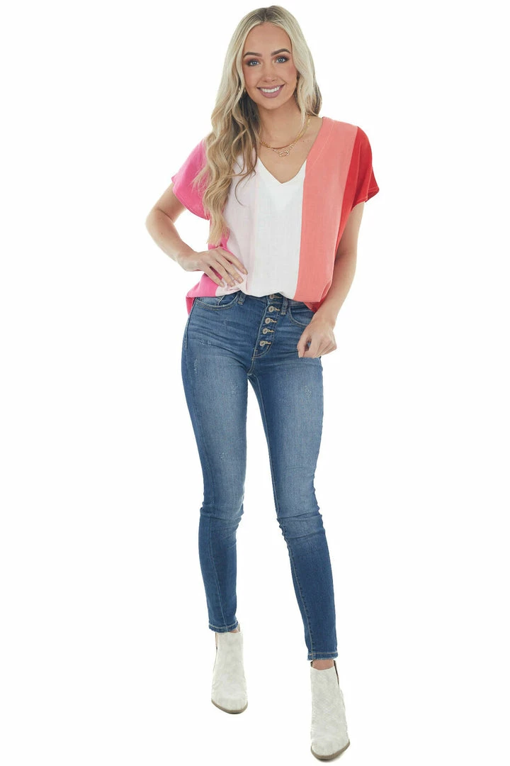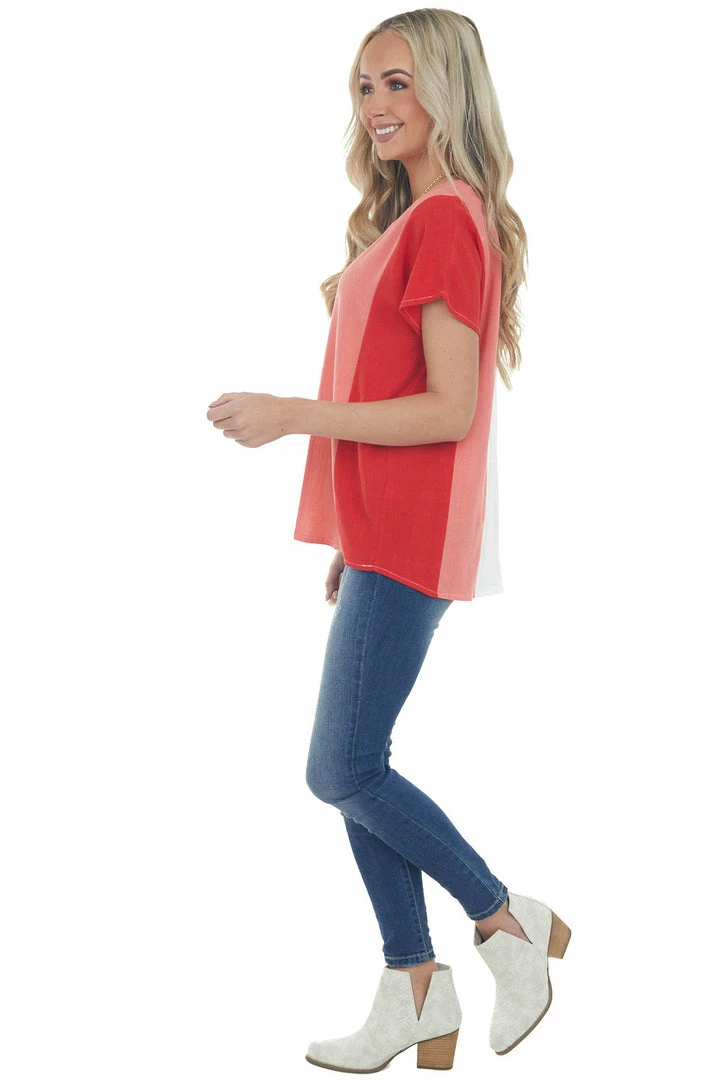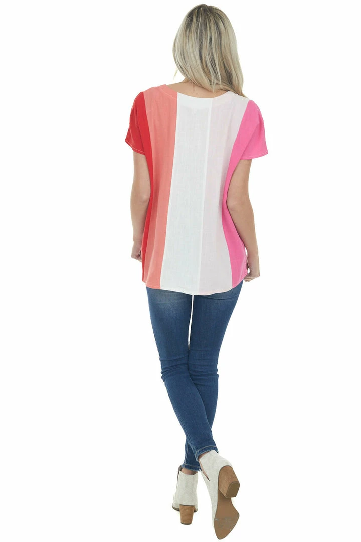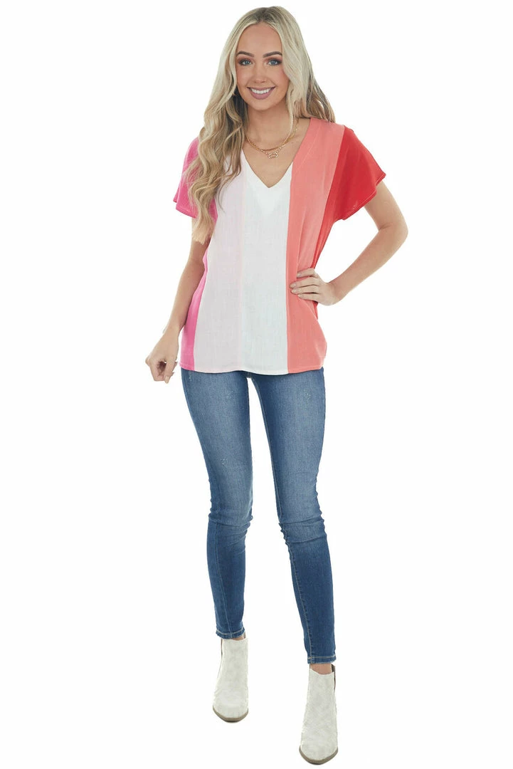 - Blush Colorblock Short Sleeve V Neck Woven Top