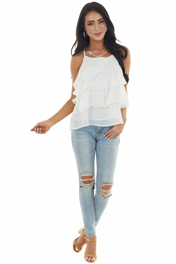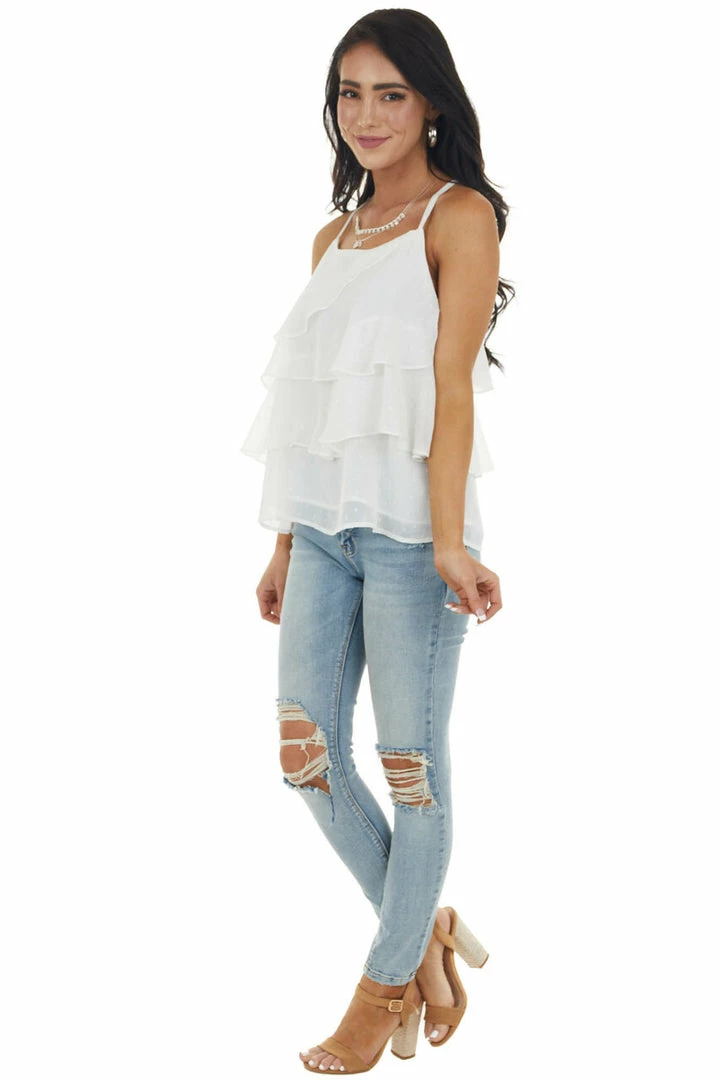 - White Thread Printed Sleeveless Ruffle Blouse with Racerback