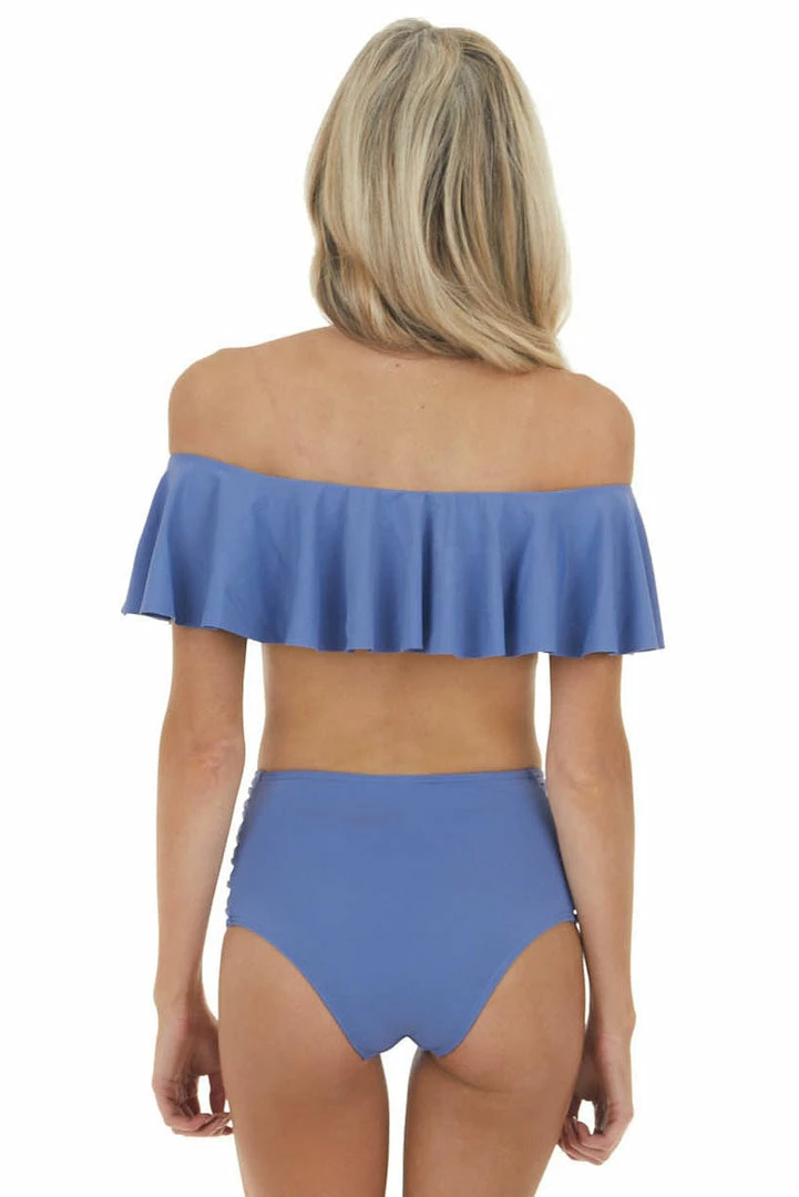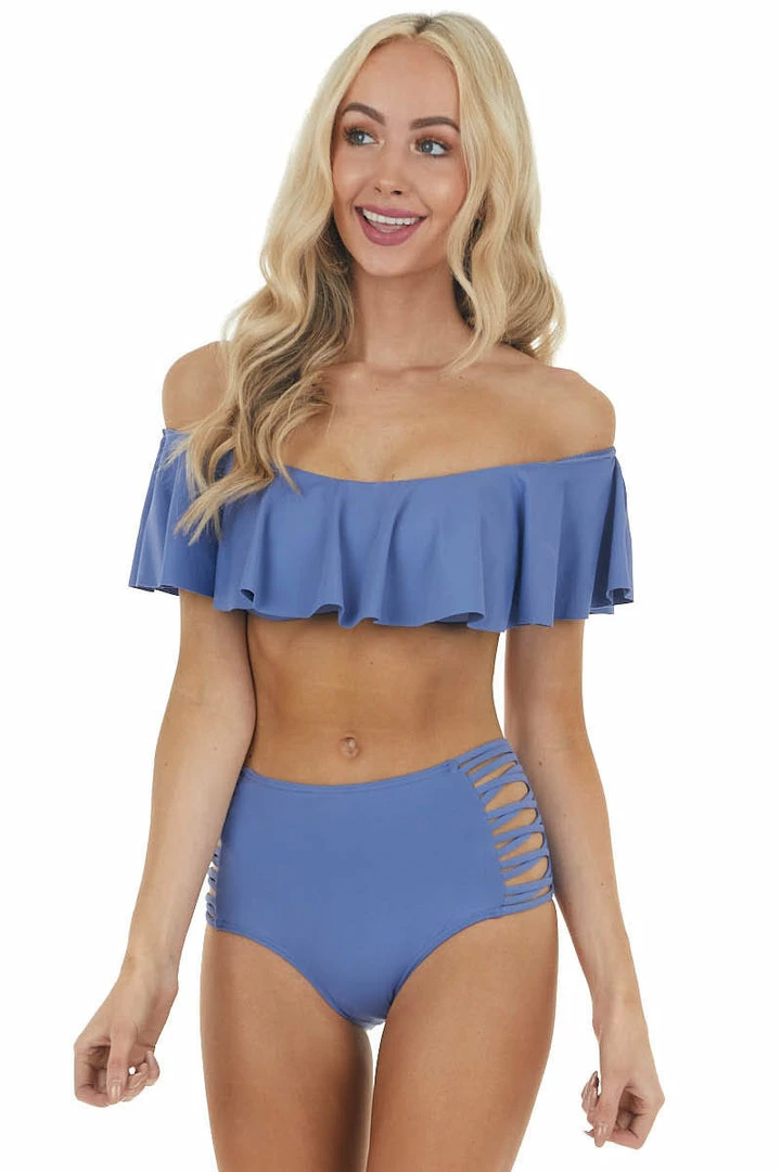 - Dusty Blue Off Shoulder Bikini Set with Strappy Details