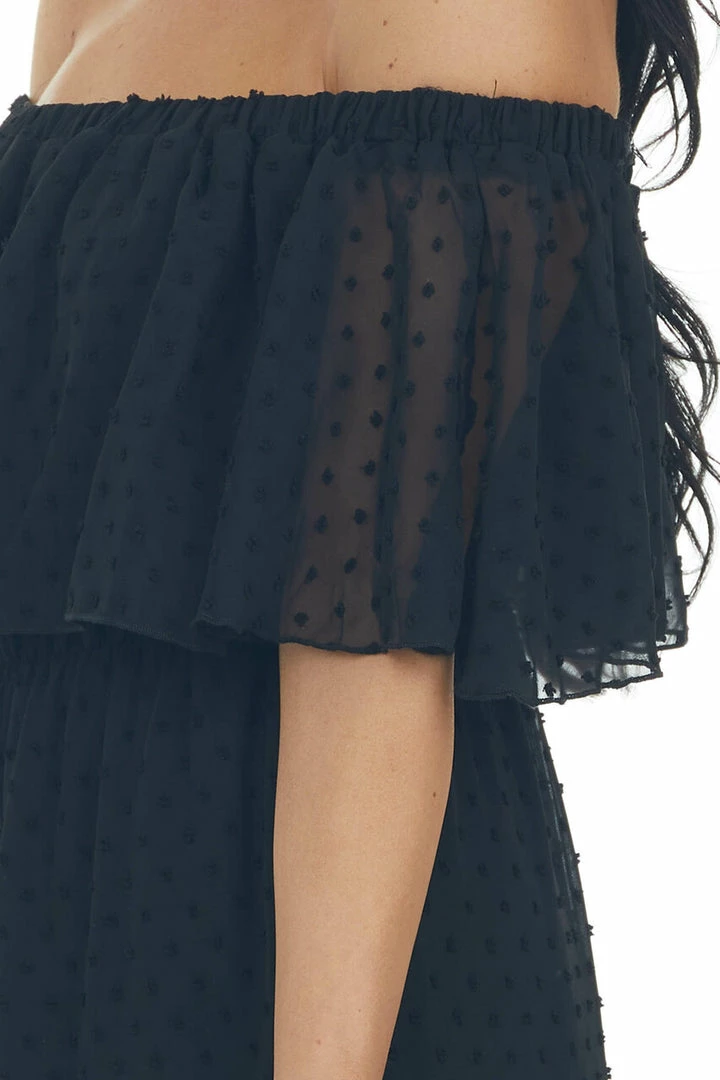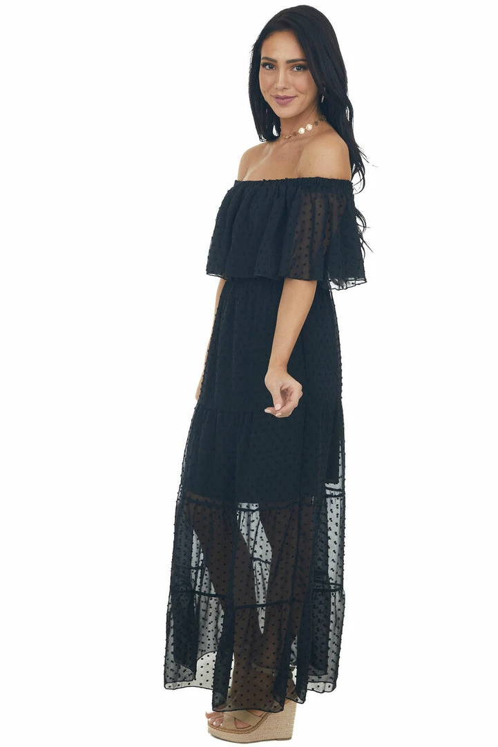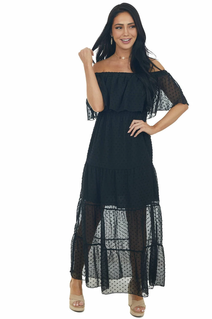 - Black Swiss Dot Ruffled Off the Shoulder Maxi Dress