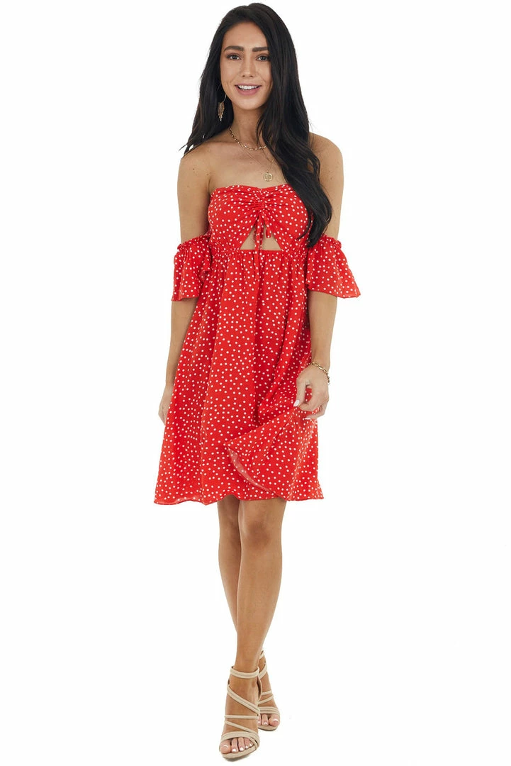 - Lipstick Red Polka Dot Off the Shoulder Dress with Ruching