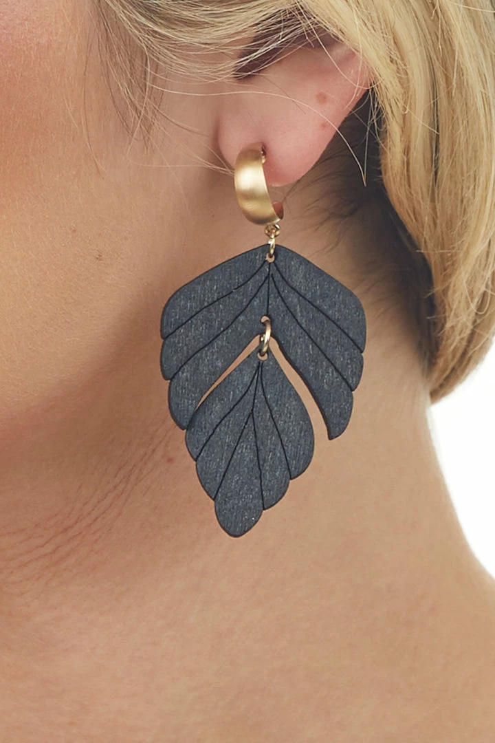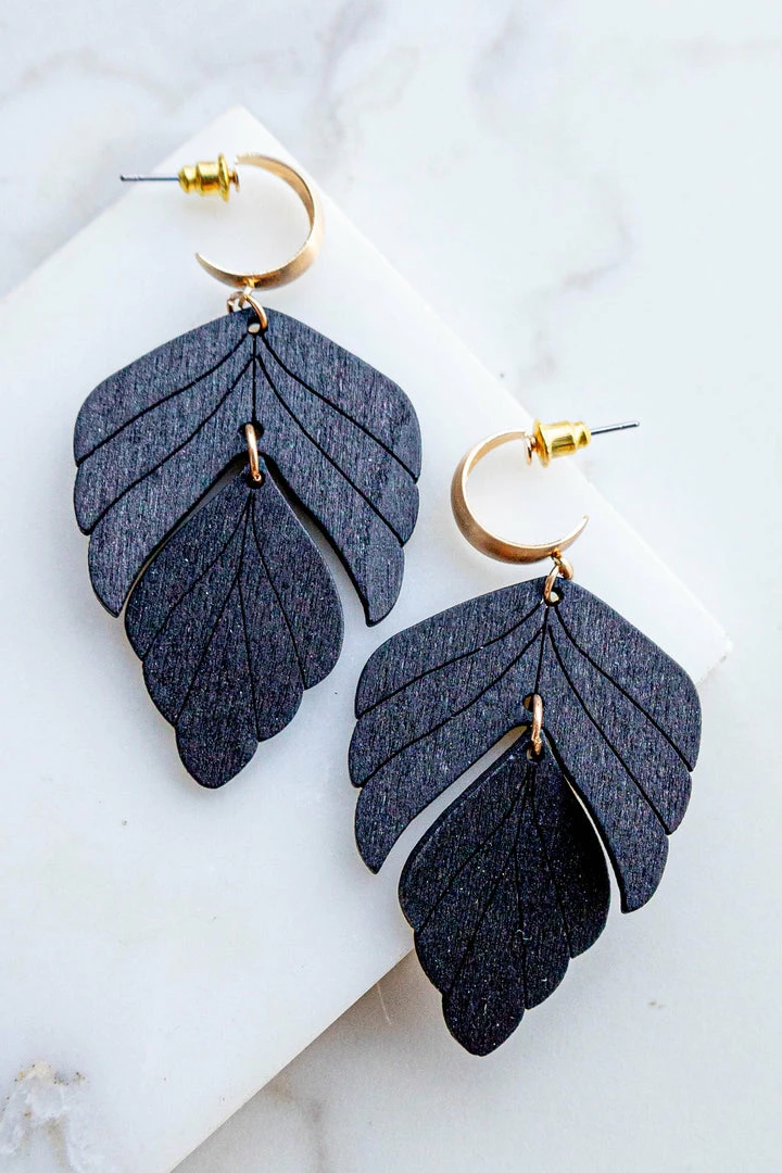 - Black Faux Wood Leaf Huggie Drop Earrings