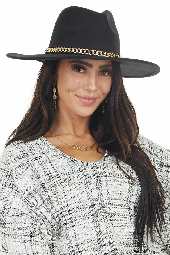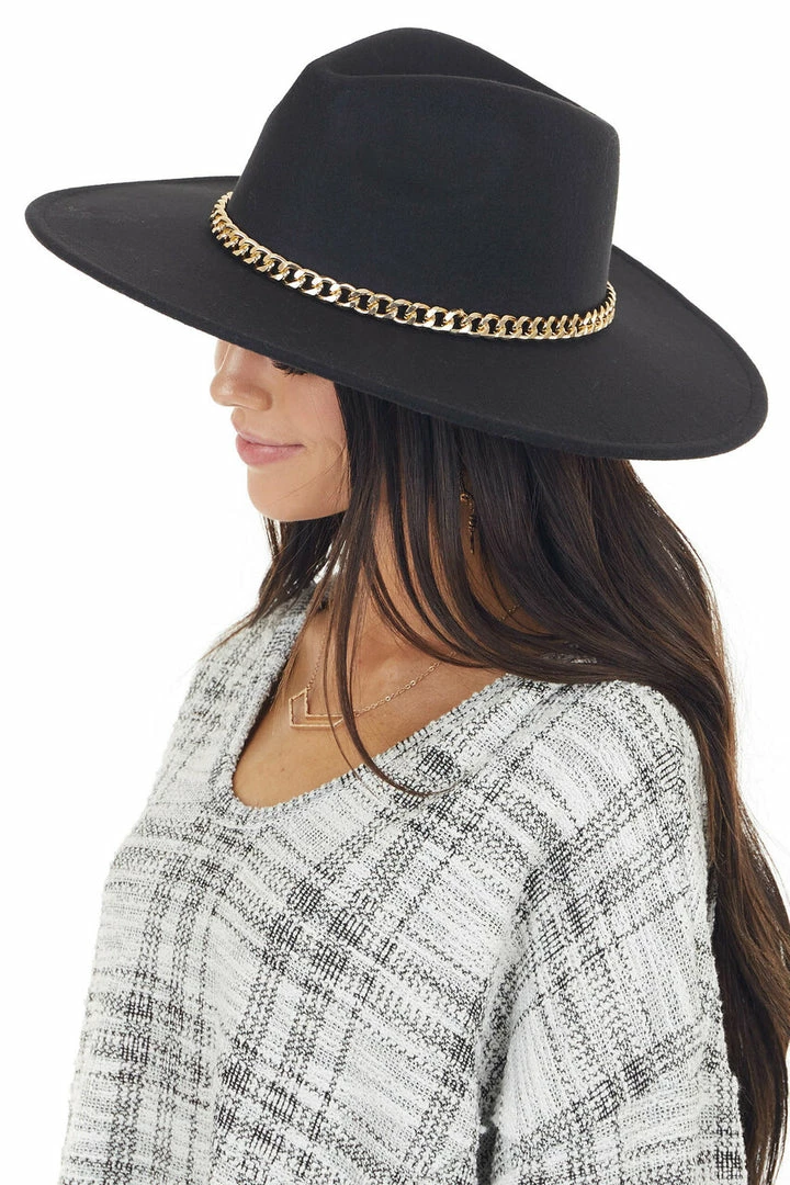 - Black Felt Flat Brim Western Style Hat with Chain Detail