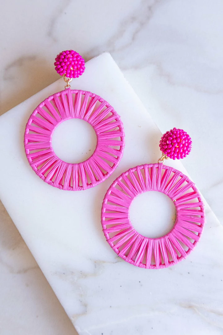 - Fuchsia Raffia Hoop Beaded Stud Drop Earrings