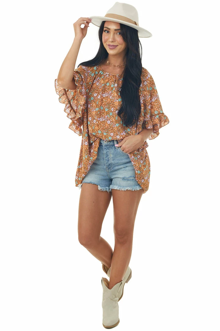 - Caramel Floral Print Half Sleeve Flowy Blouse